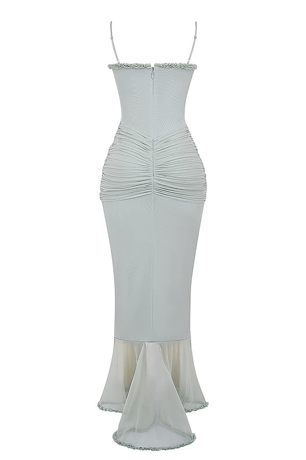 Los pliegues perfectamente colocados en la cadera ajustan tu figura, y el delantero con caída en cascada está adornado con los volantes más delicados. El dobladillo fluido se extiende hacia un pequeño tren en la parte trasera, que se arrastra de manera hermosa mientras caminas. Se cierra con cremallera en la parte trasera para ponerlo con facilidad y luce ultrafemenino con tacones altos que se asoman por debajo del dobladillo mientras caminas.