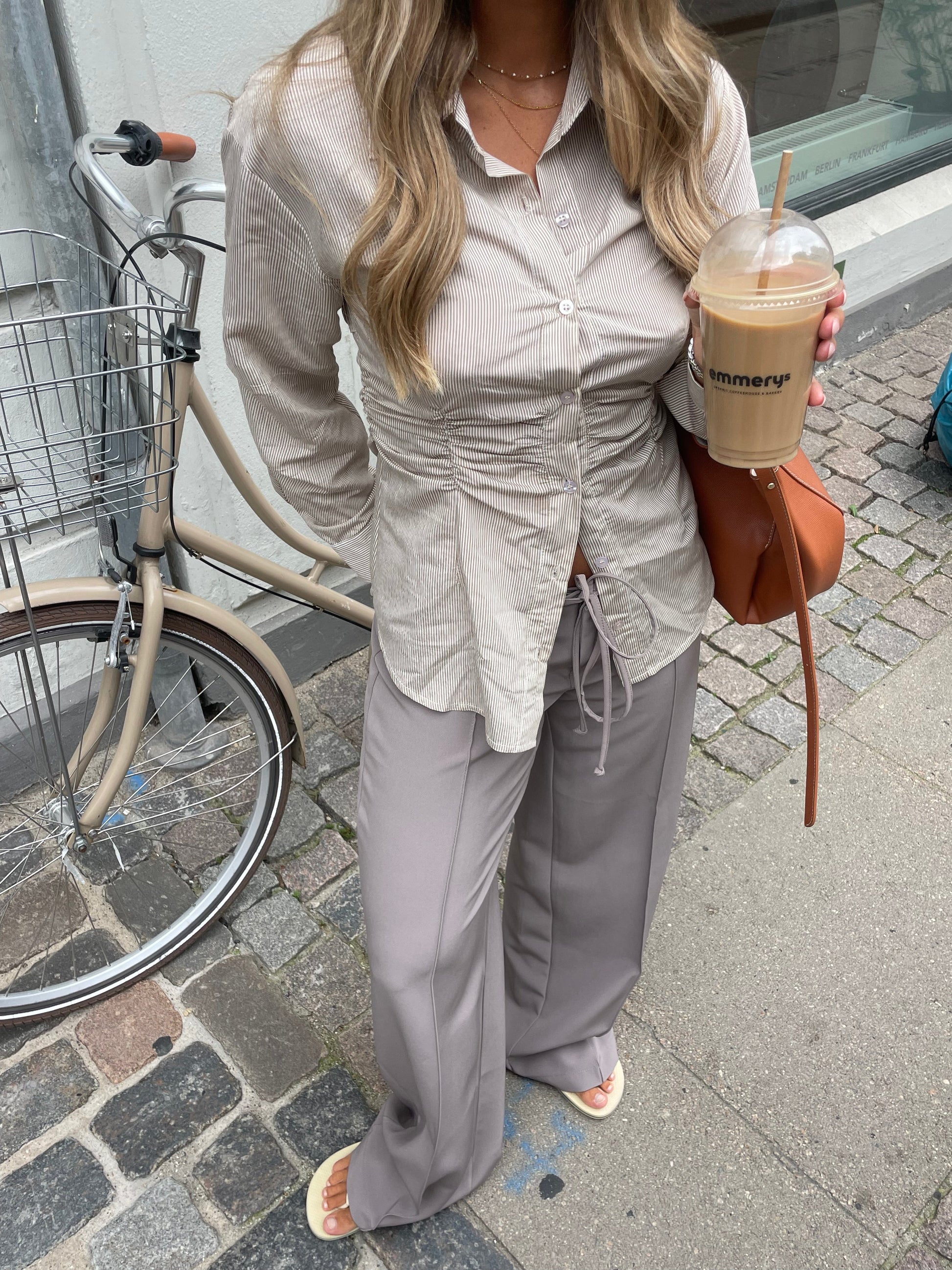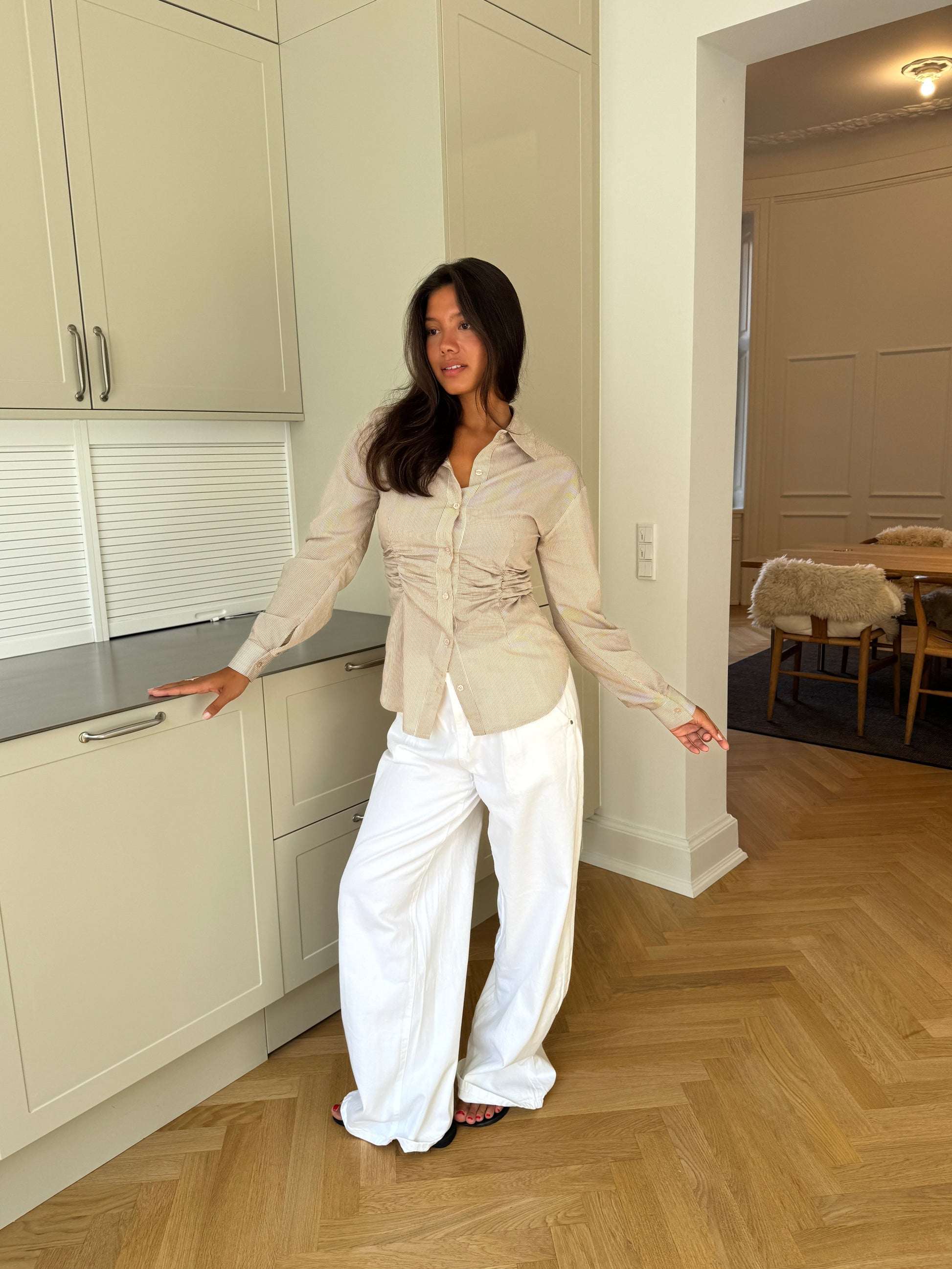 The Chloe shirt is made from a light and airy fabric with a delicate striped print that gives it a fresh and timeless look. It has a smocked detail at the waist for a flattering fit and buttons all the way down the front. The collar at the neck and the tailored cuffs on the sleeves ensure that the shirt fits well and has a more stylish finish. Perfect for both everyday wear and more formal occasions.