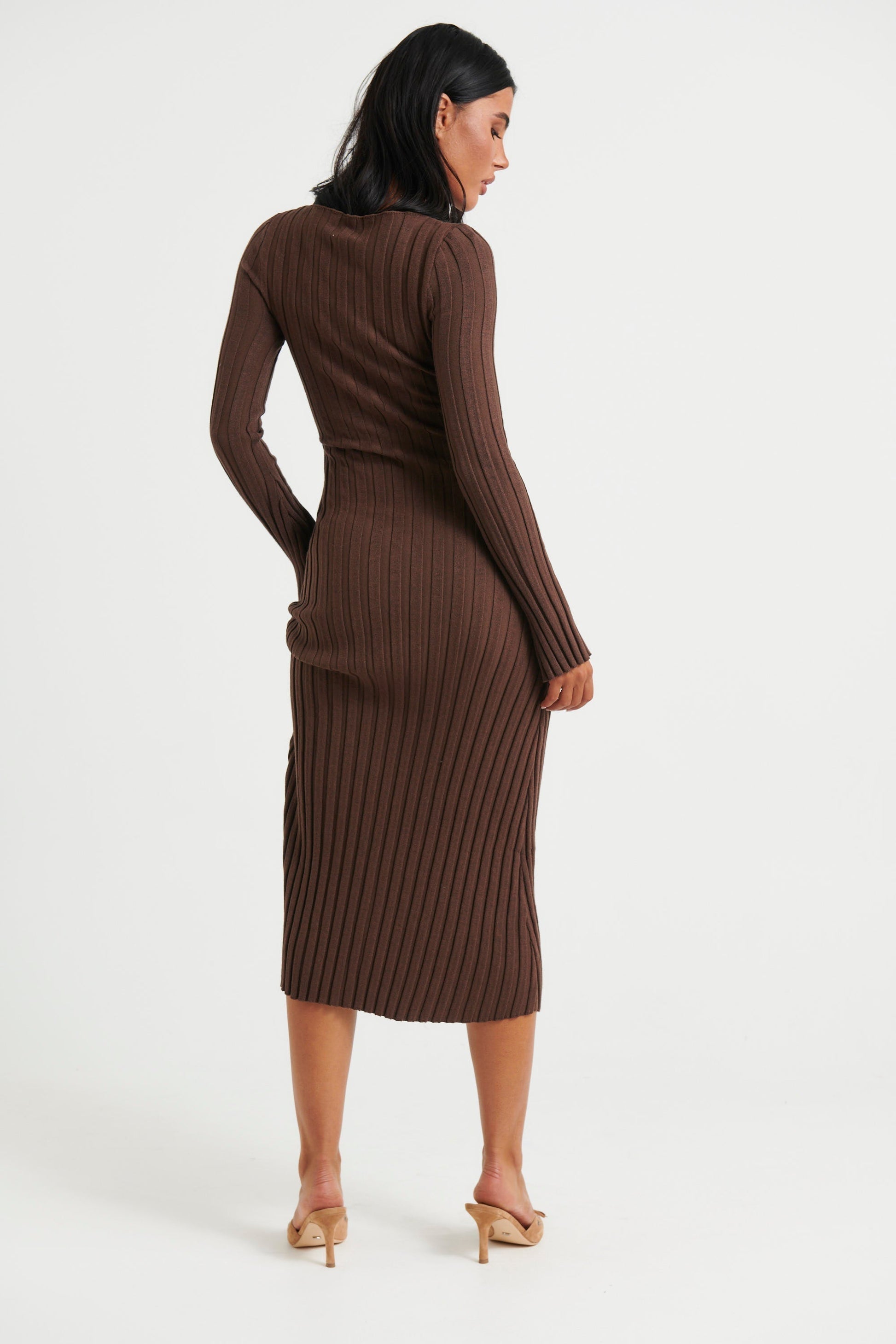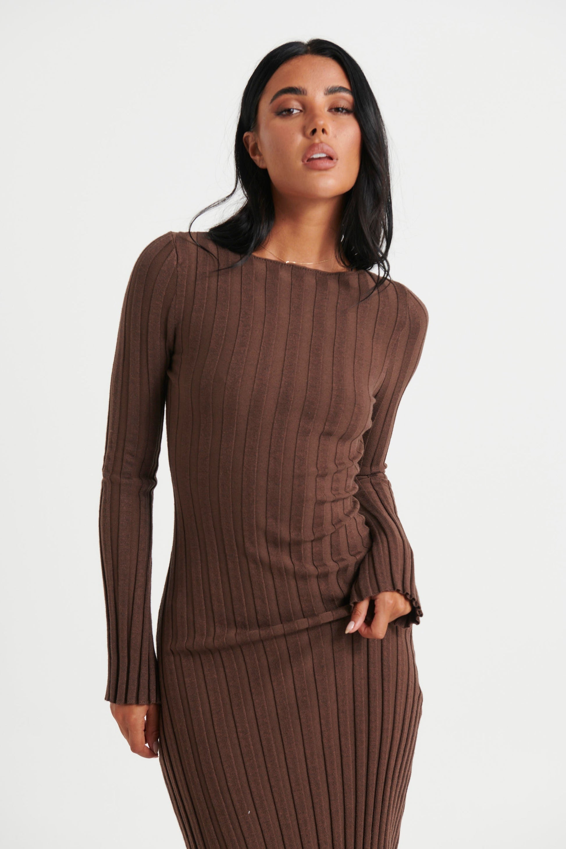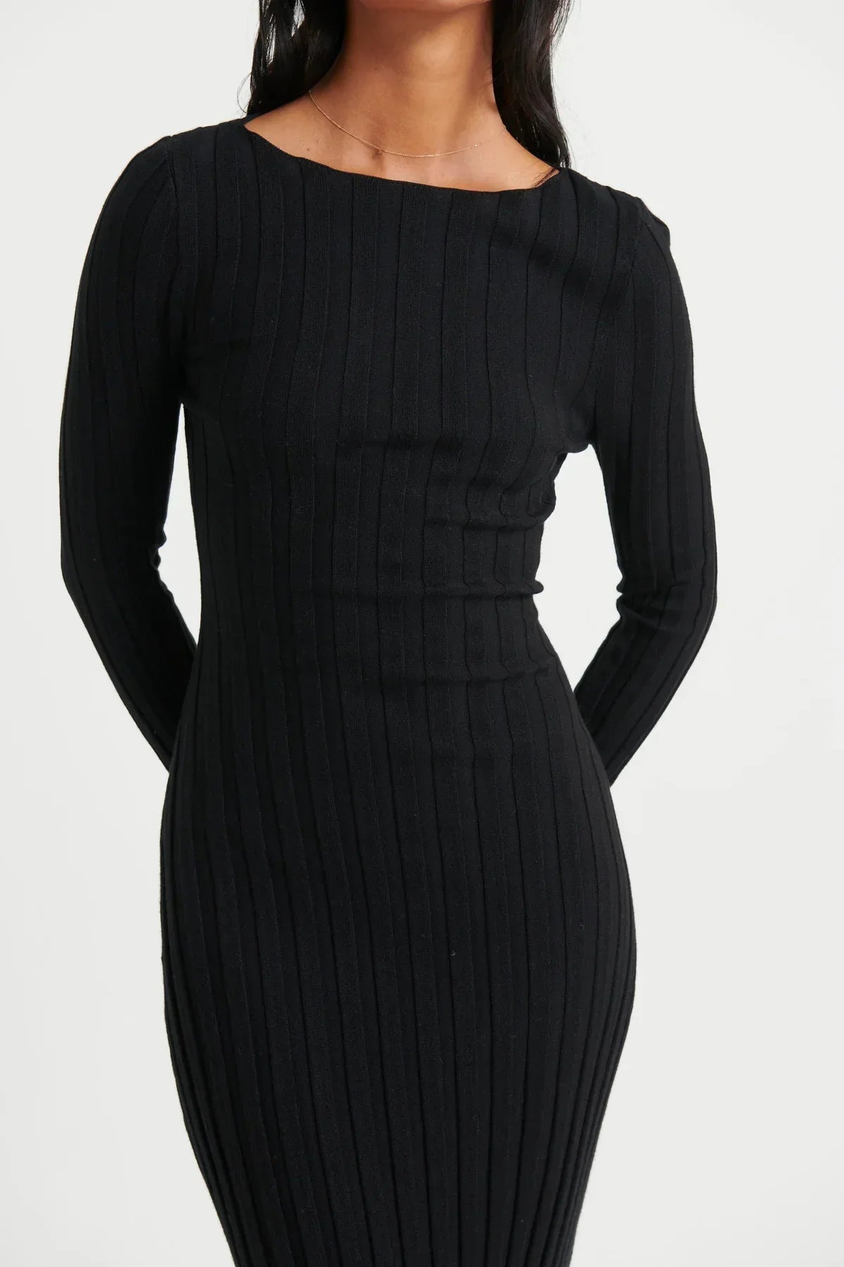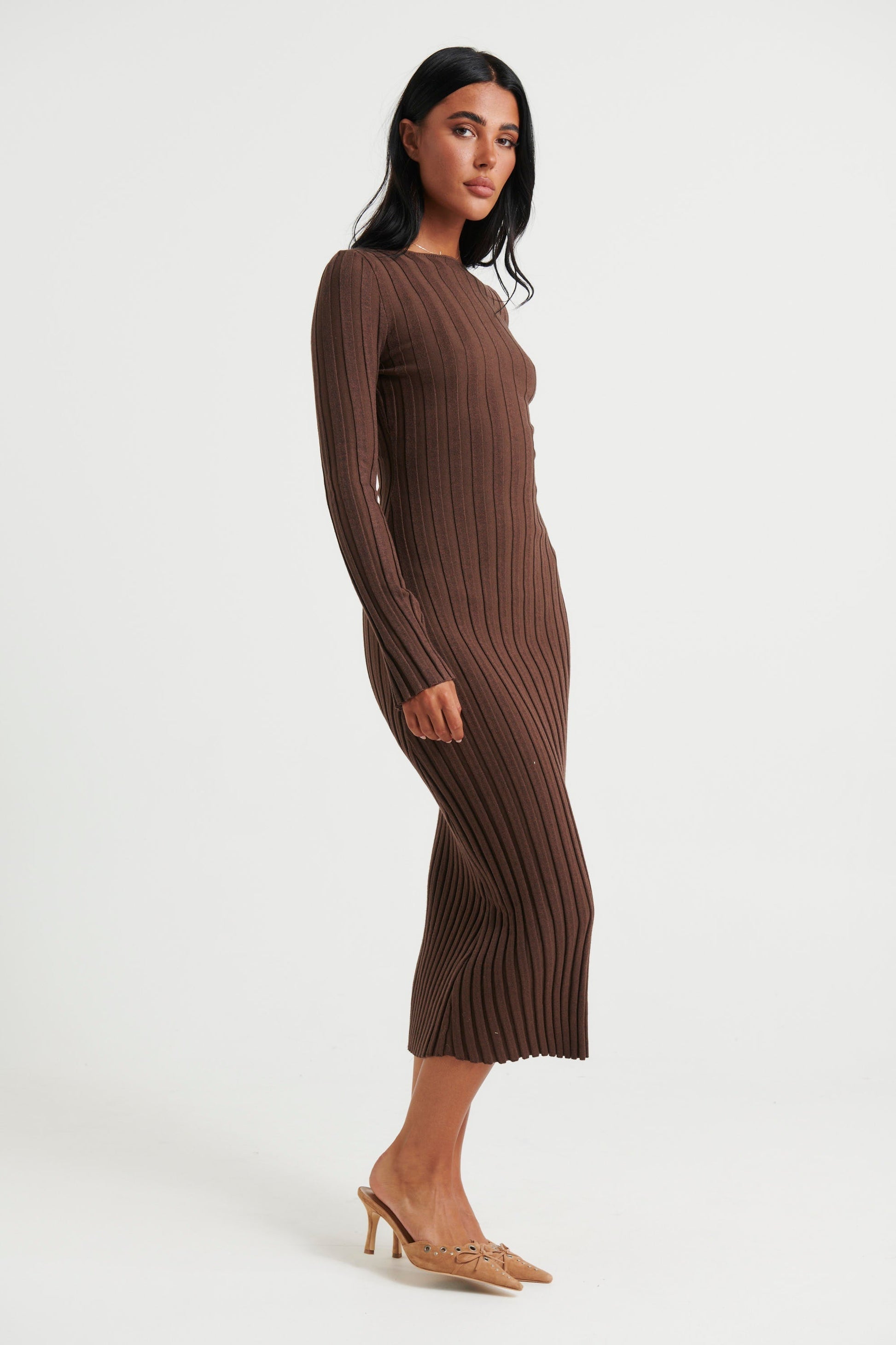 Presentamos nuestro vestido midi Eline. Con mangas largas y material acanalado elástico sin forro, está confeccionado con una mezcla de 50% viscosa, 28% poliéster y 22% nailon. Perfecto para cualquier ocasión, este vestido ofrece comodidad y elegancia en uno solo.