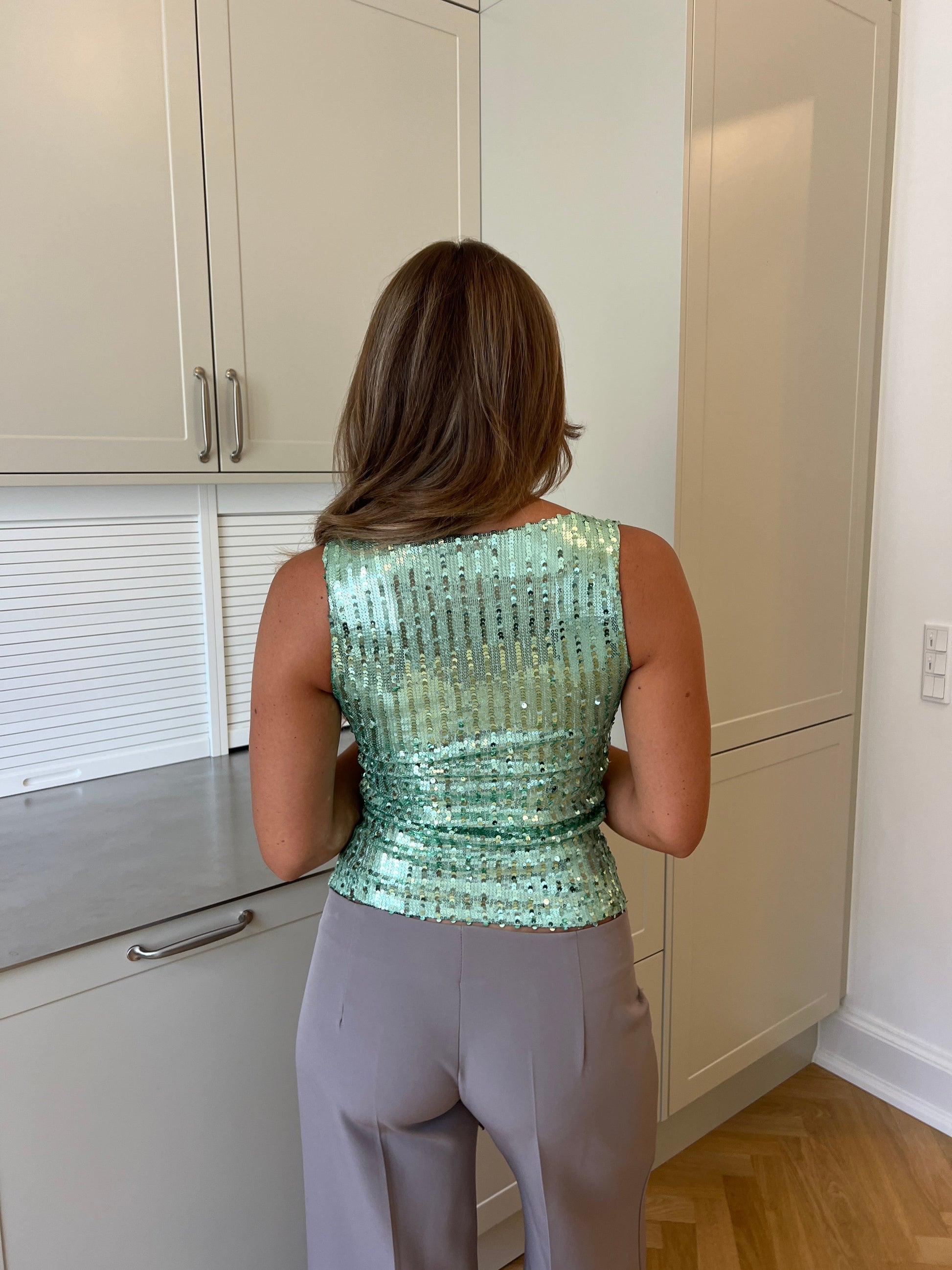 The Francesca sequined V-neck top is a close-fitting and flattering sequined top that highlights your figure in a simple and elegant way. The top has a soft inner lining under the bust that makes it opaque. The top comes in the most beautiful light green color and will make any outfit shine. Perfect for a night out on the townπ