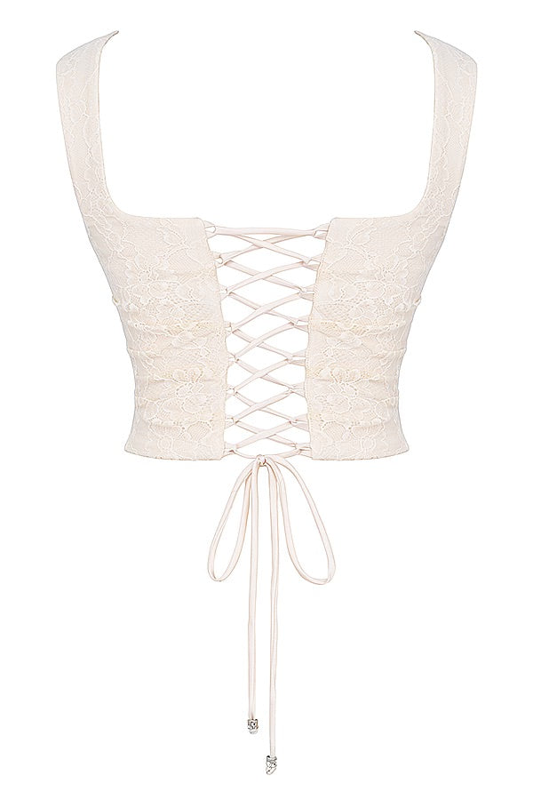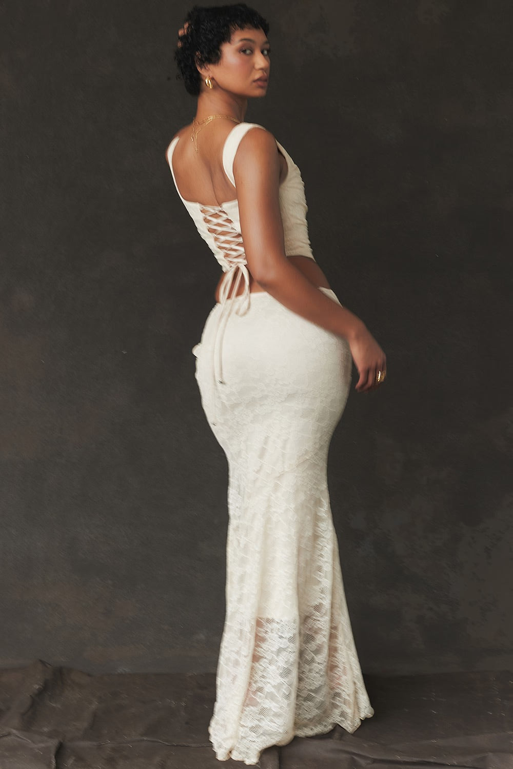 Bienvenida a todo lo femenino en tu armario con nuestro bonito conjunto 'Gemma'. Cortado en una delicada tela de encaje floral elástico en un hermoso tono crema vintage, presenta una corsetería increíble en el corpiño para un ajuste ceñido a la cintura y un delicado drapeado que realza la figura.