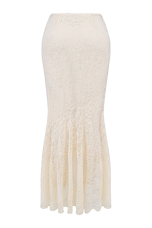 La falda maxi captura perfectamente la elegancia romántica. Hecha de un hermoso encaje floral elástico en tono crema vintage, con delicados detalles florales, se coloca a la altura de la cintura y cae suavemente sobre las caderas. Viene con una enagua removible y unas braguitas a juego, por lo que puedes llevarla con o sin la enagua. Nos encanta sin ella. El dobladillo es simplemente precioso y se mueve con gracia al caminar. Se cierra con un zipper en el costado para mayor comodidad.