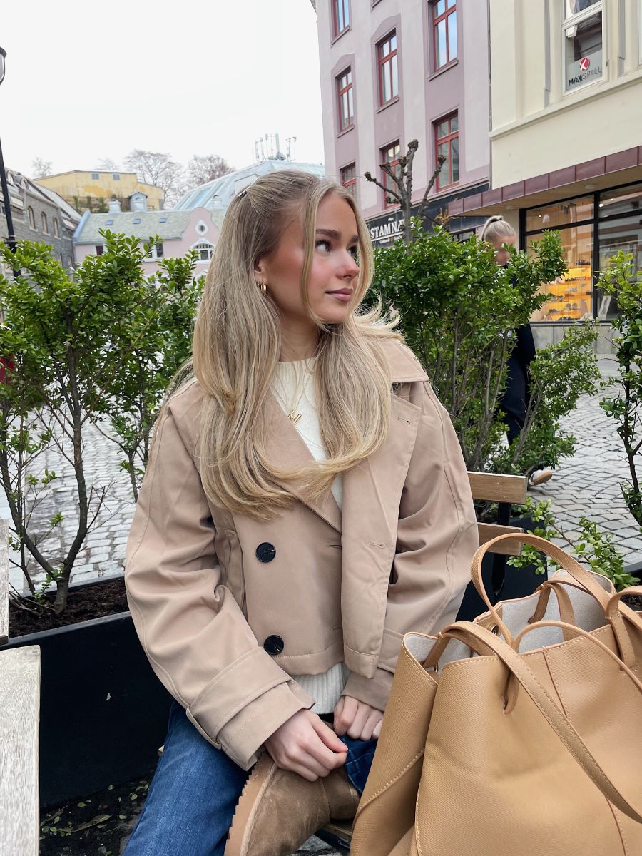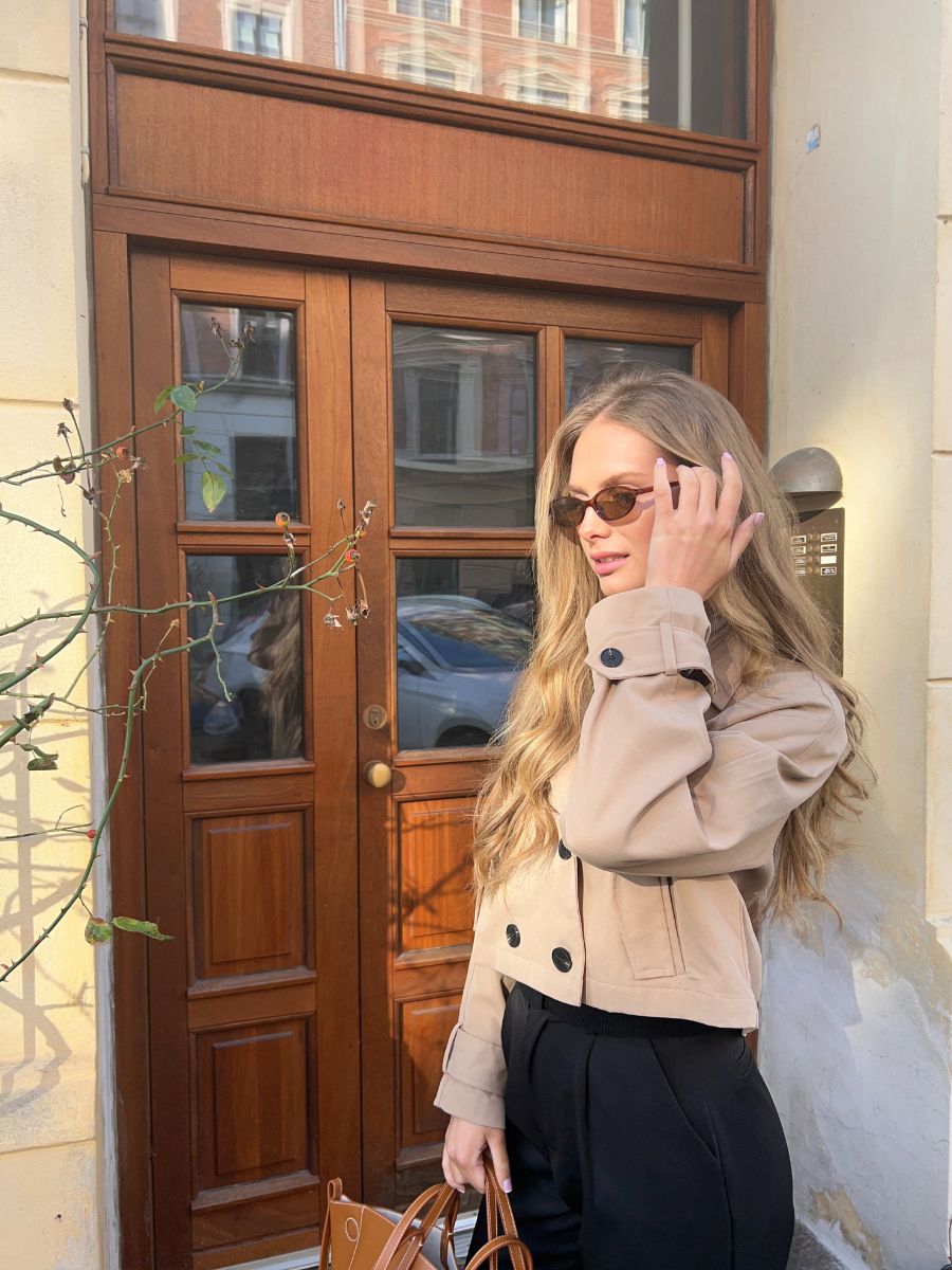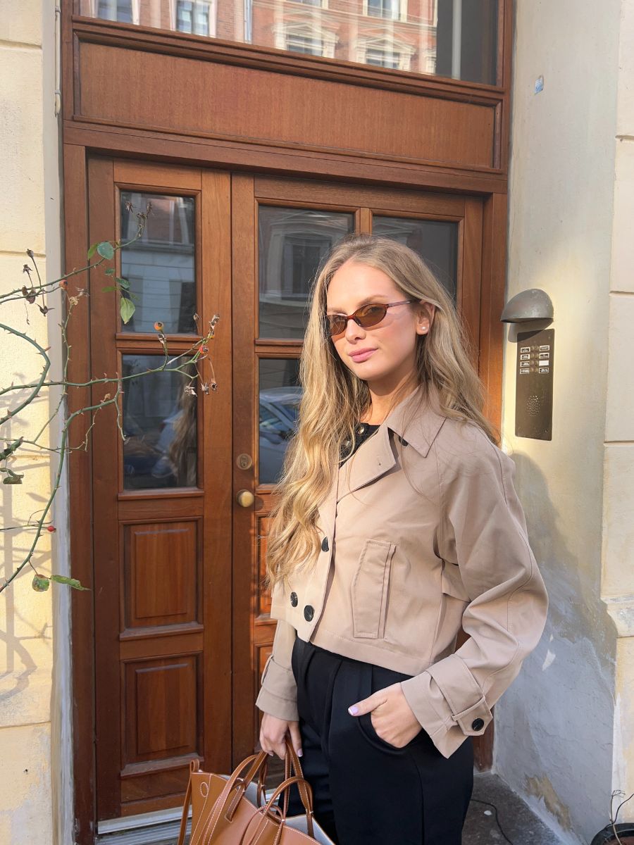 Our Isa trench coat has a short and loose fit. The jacket has wide sleeves and 2 large side pockets. It has a button closure at the front and a bold detail at the back with a strap and button detail.π€