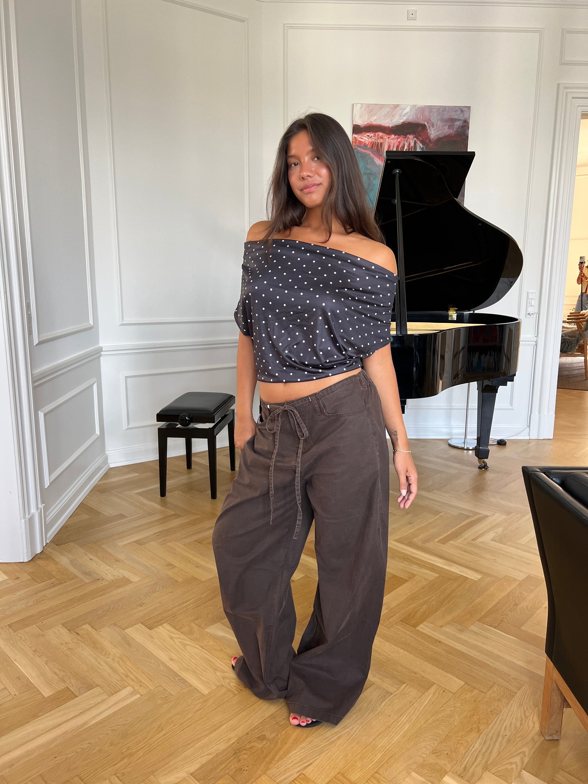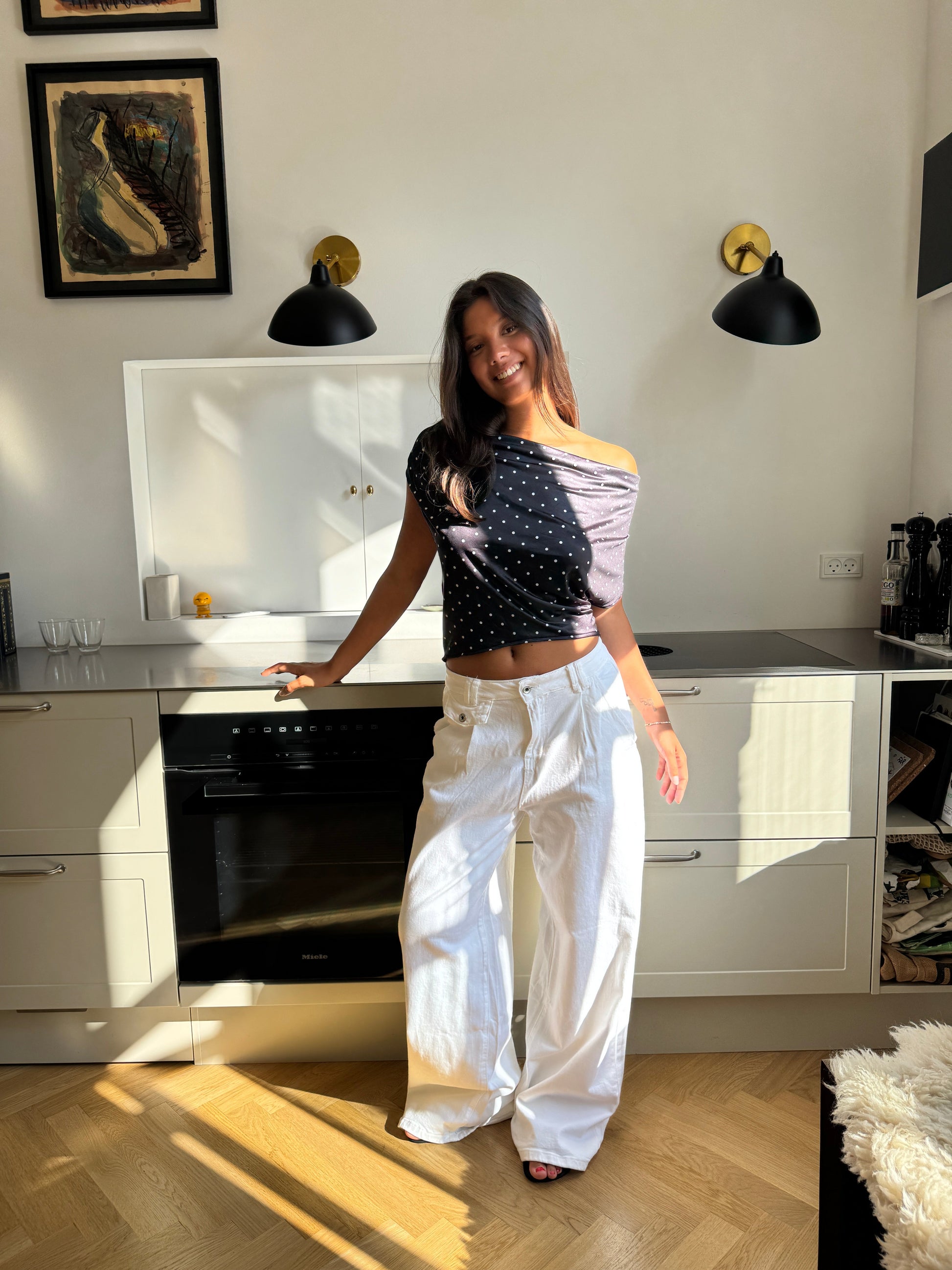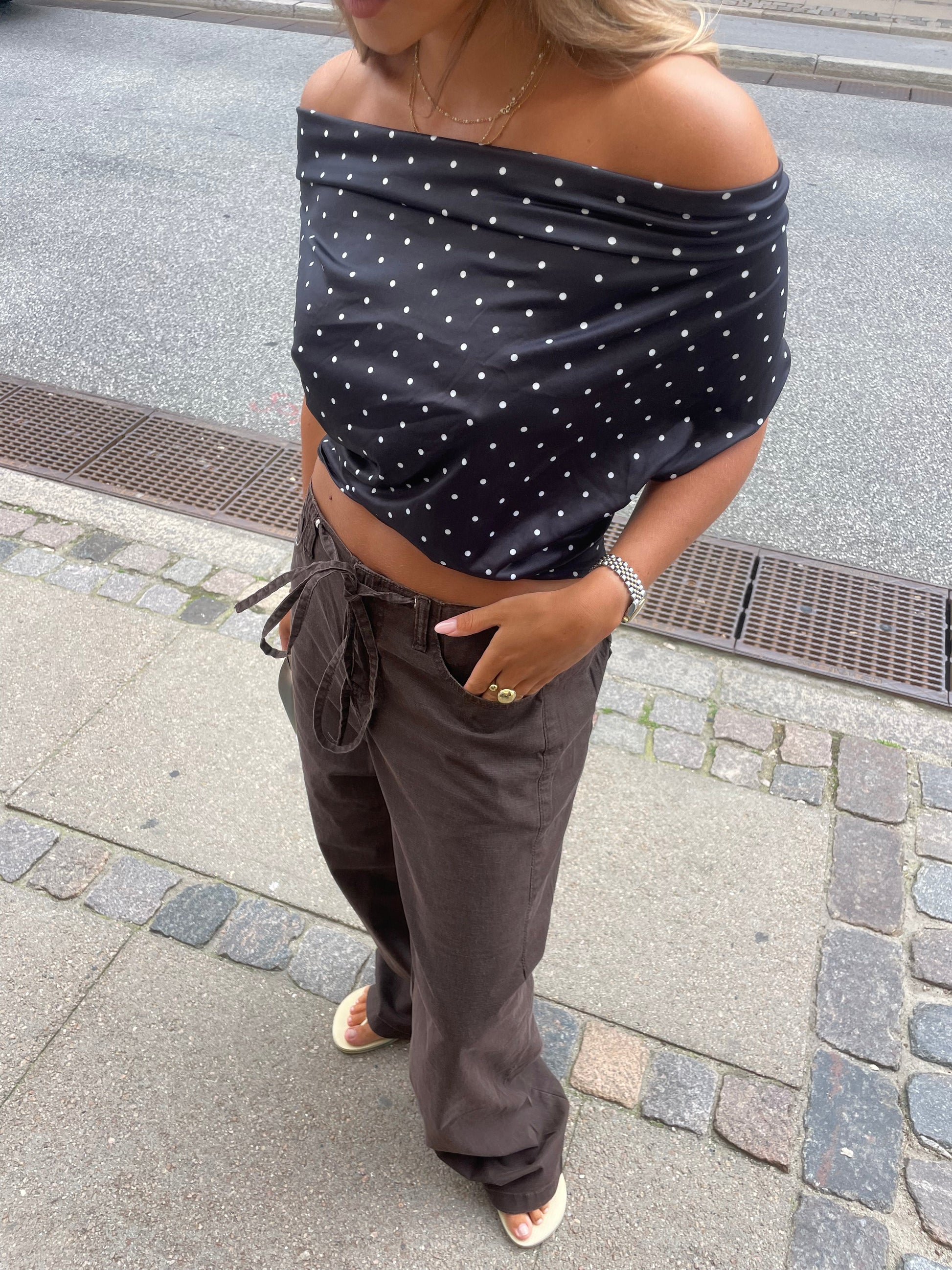 The Lara top is made from a lightweight, shiny material with black and white polka dots, giving it a retro yet stylish look. The top can be styled as an off-shoulder, one-shoulder, or halter neck, offering many styling options for the individual.