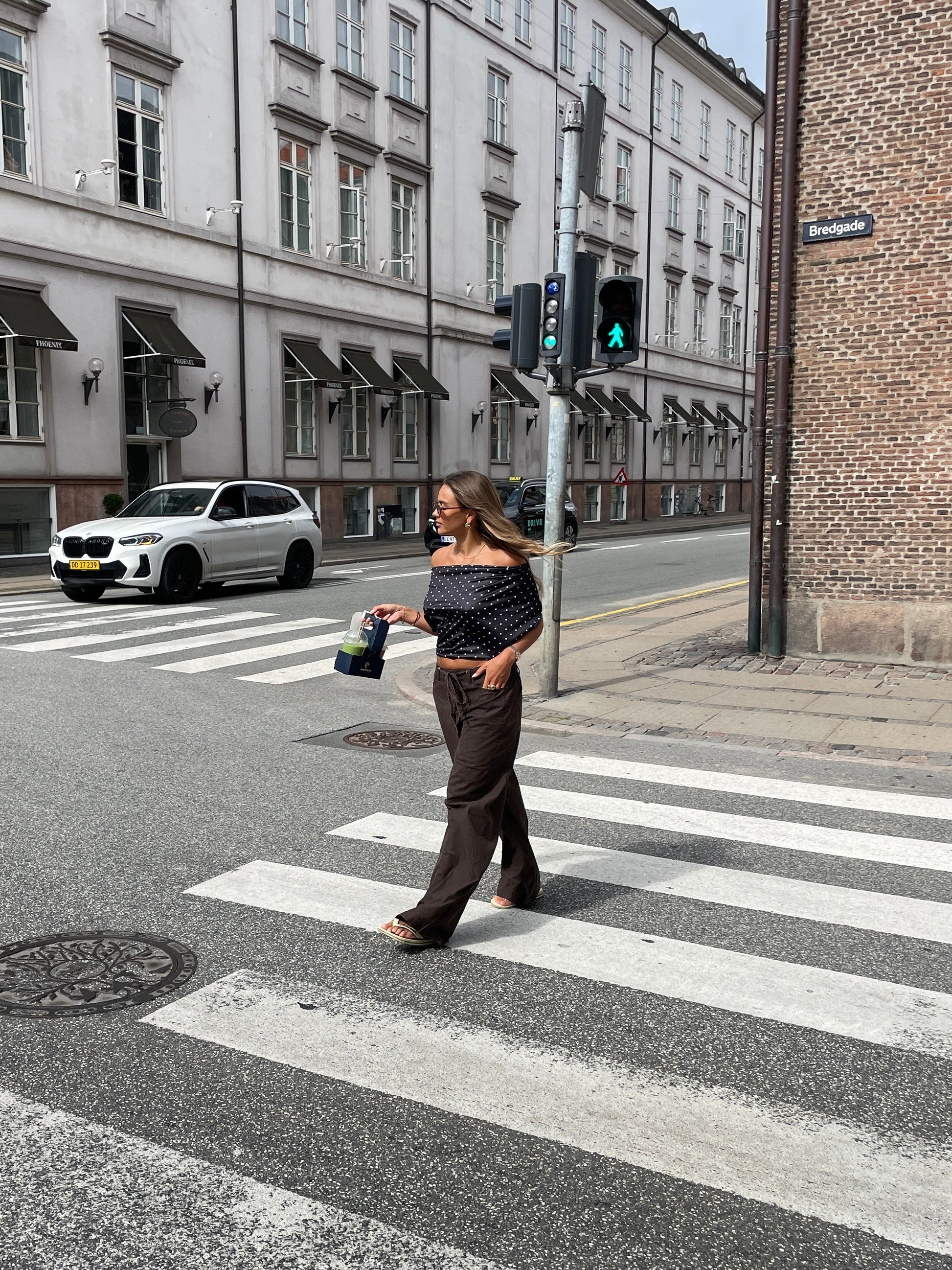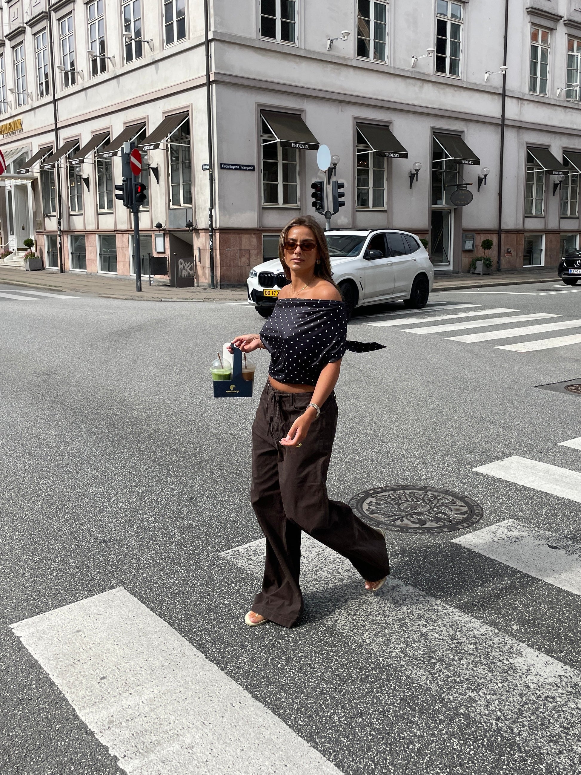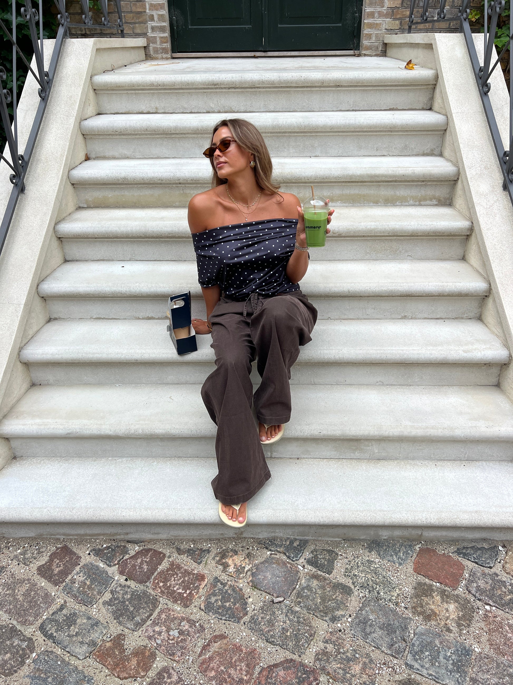 The Lara top is made from a lightweight, shiny material with black and white polka dots, giving it a retro yet stylish look. The top can be styled as an off-shoulder, one-shoulder, or halter neck, offering many styling options for the individual.