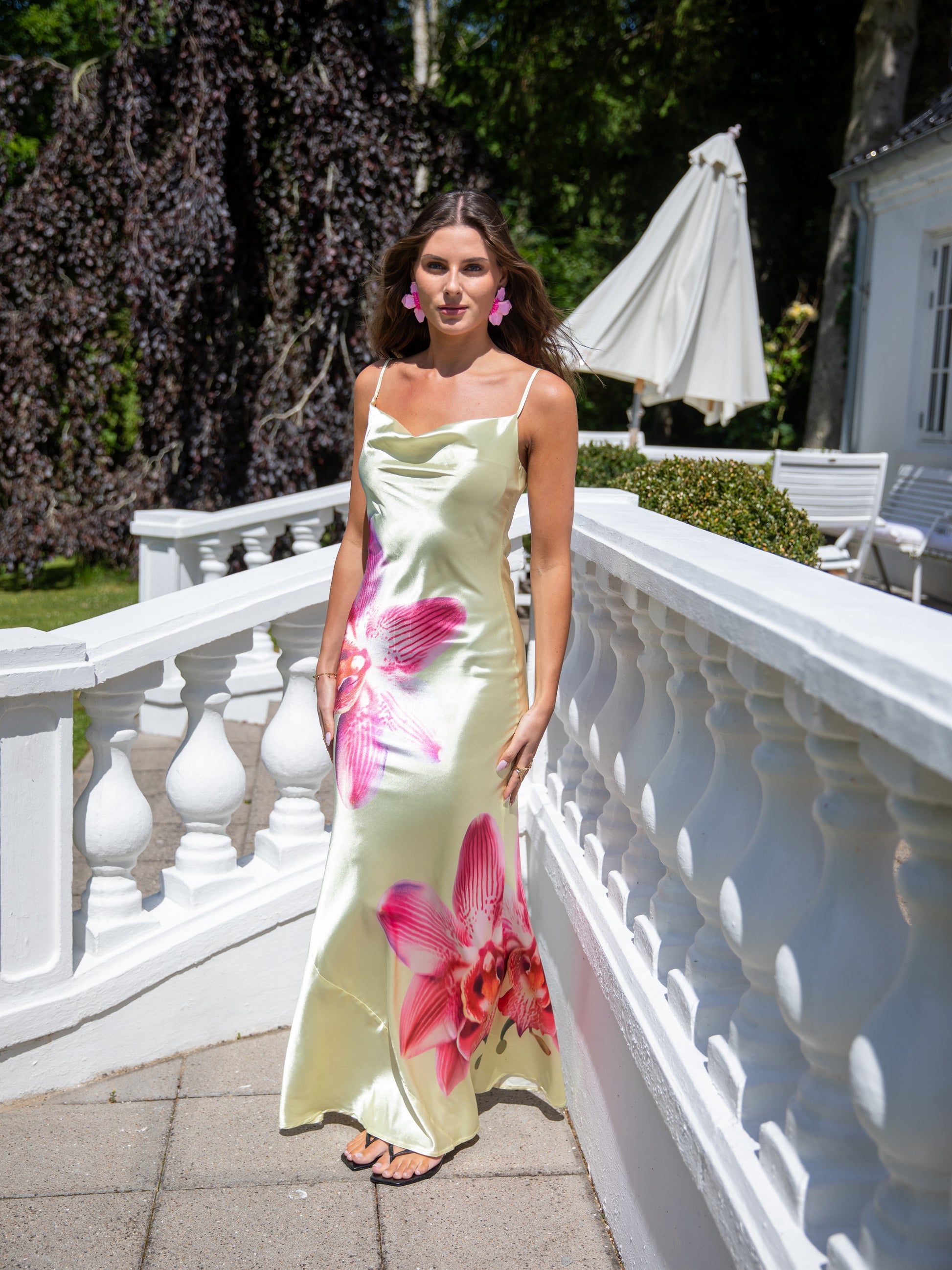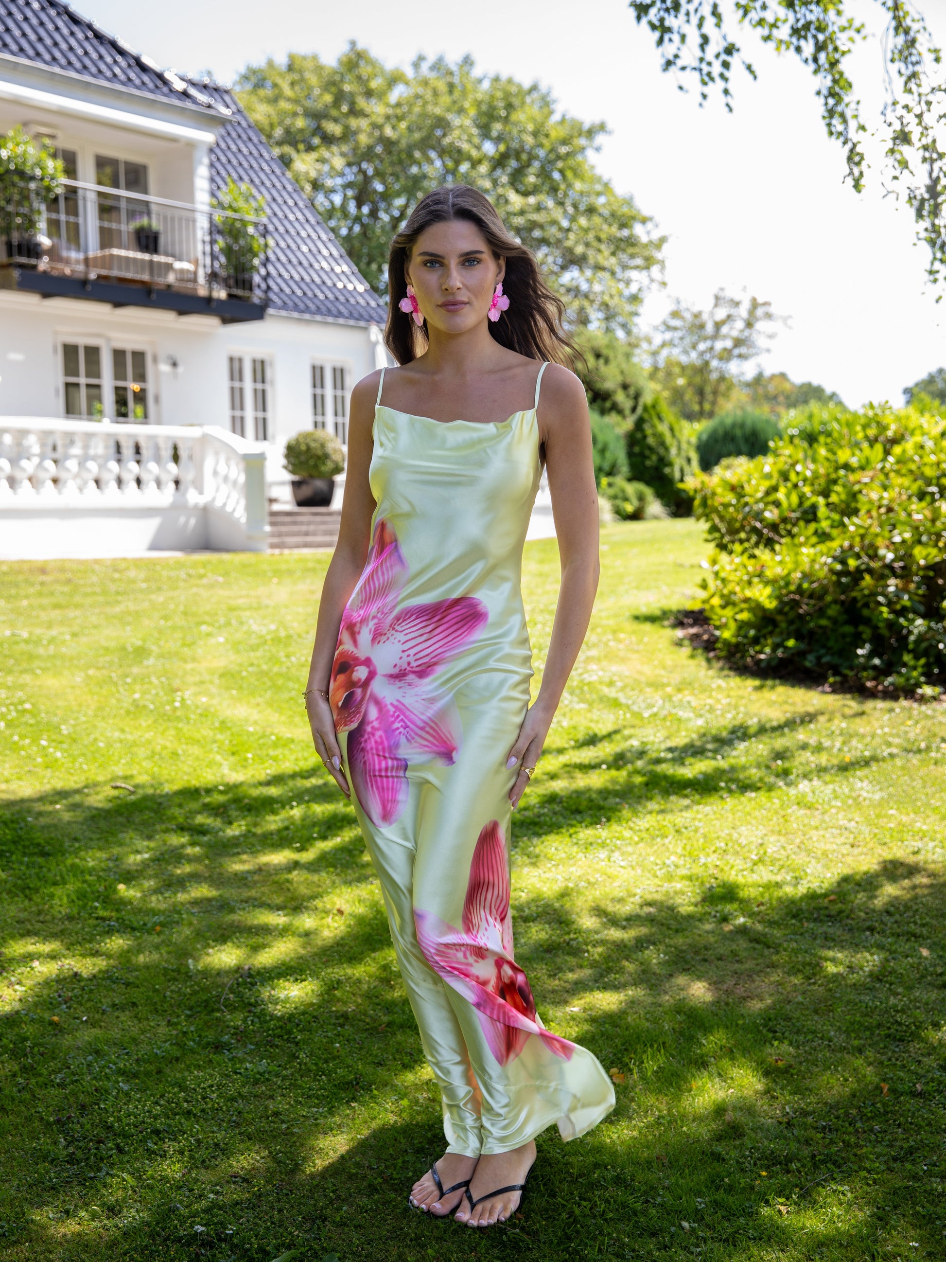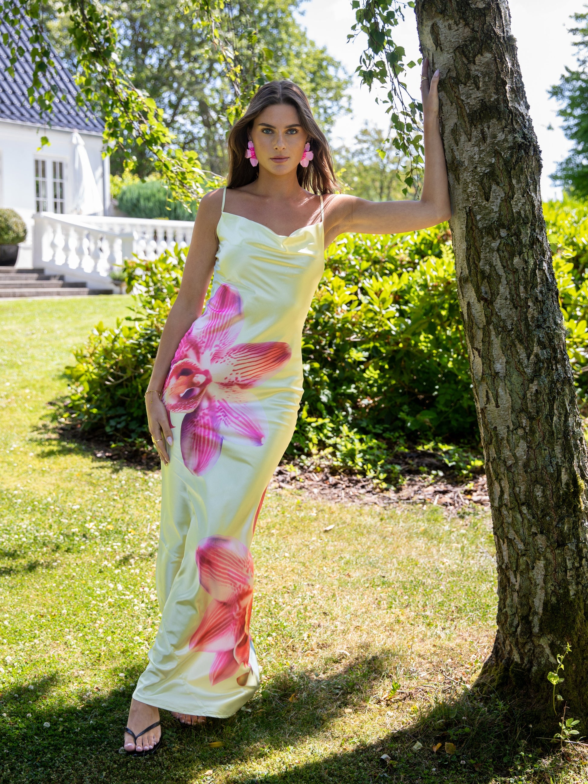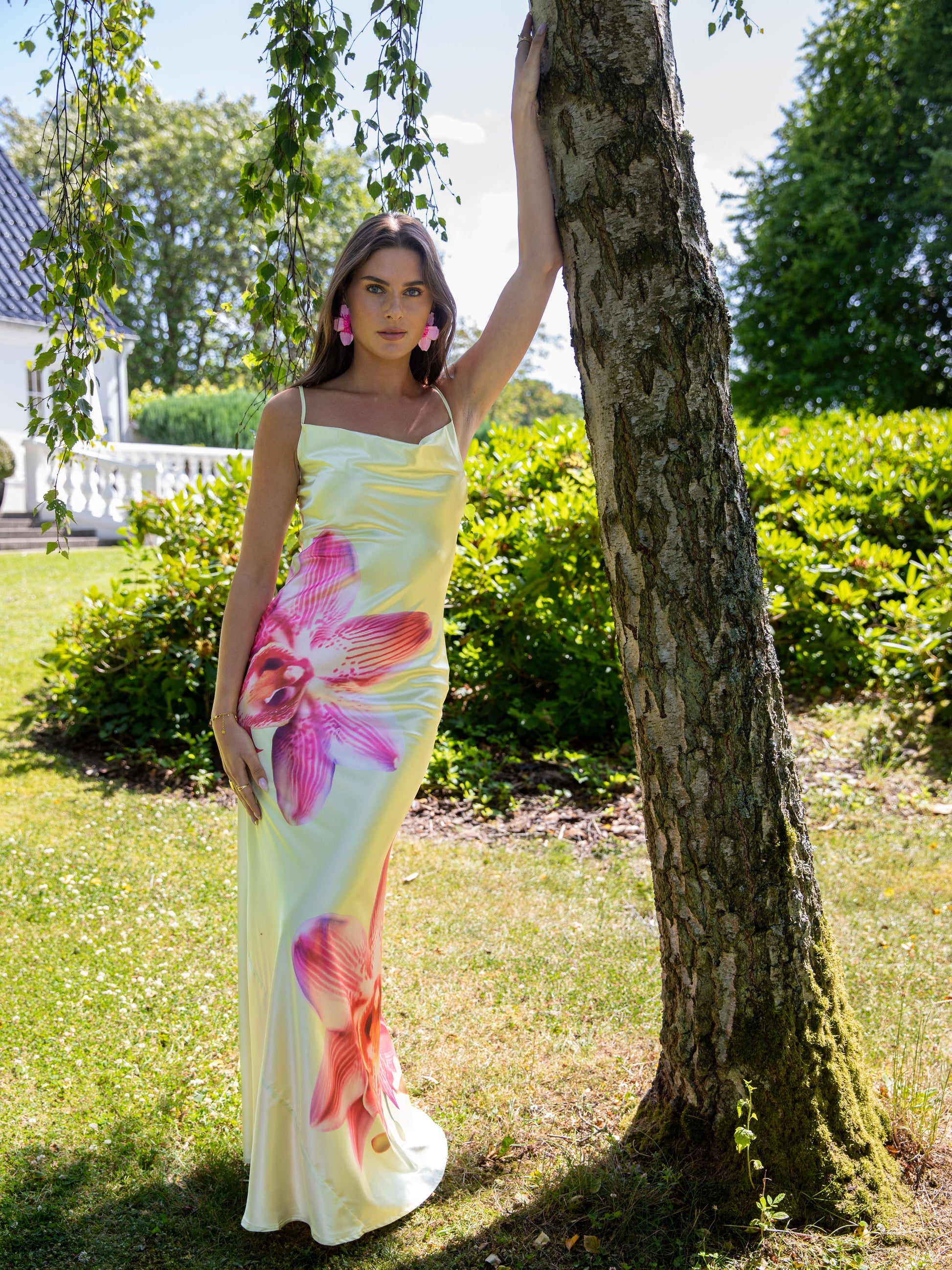 The Lila maxi flora dress is a dream of a summer dress with its light yellow satin look and colorful floral print that exudes lightness and summer. It has thin straps and a delicate drawstring closure at the back, which both provides a nice fit and a cute extra detail. The light satin material makes it comfortable to wear and perfect for both sunny days in the city or as a guest at summer parties.