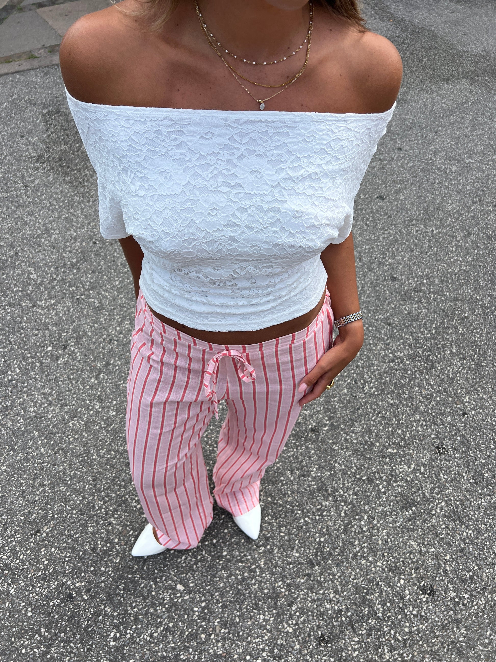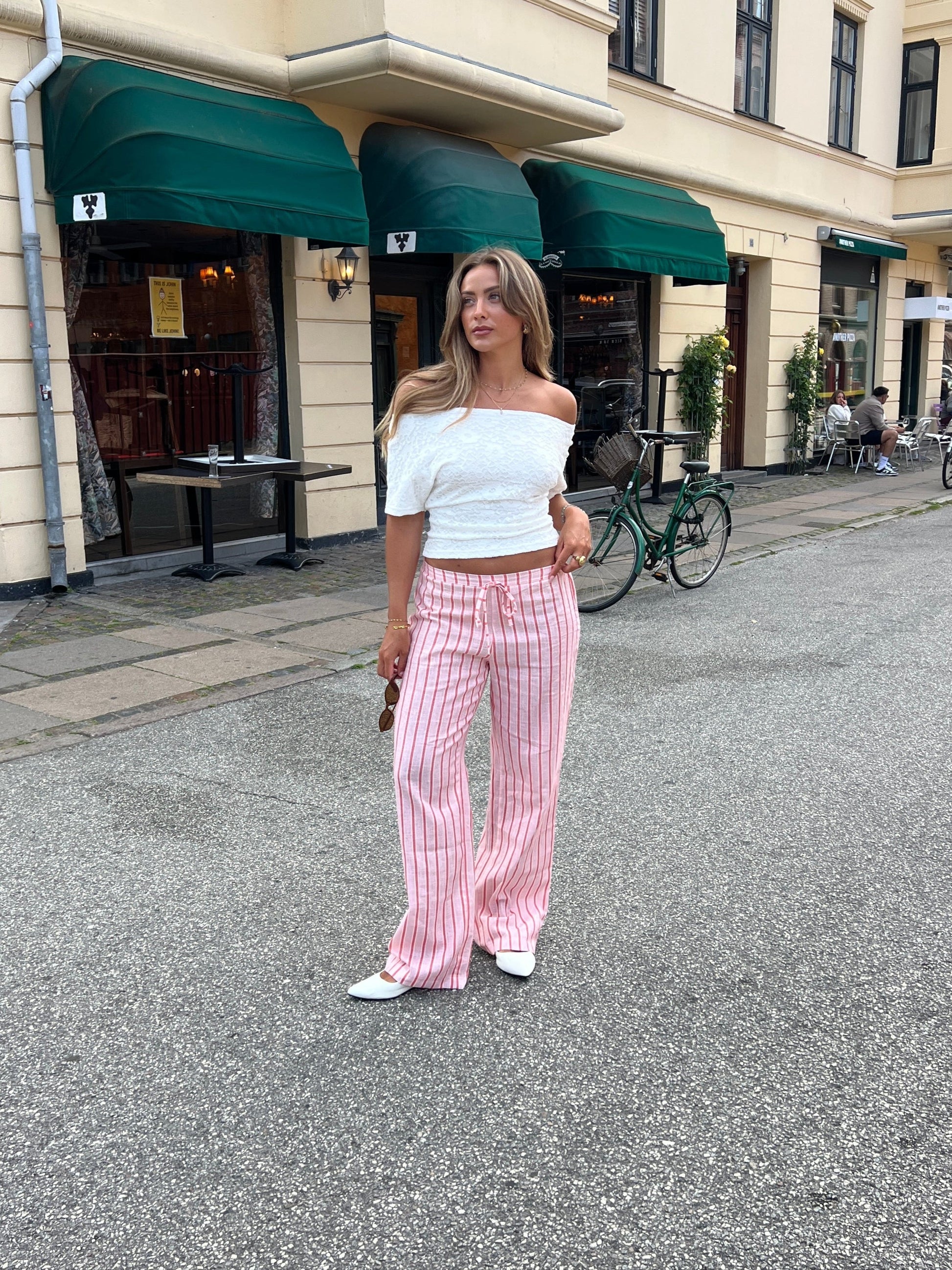 Our Liora linen pants are a pair of light and airy pants with delicate pink stripes on a soft pink background. They are low-waisted and have a tie at the waist, which gives the pants a cute little twist. Perfect for home use and summer days when you want to feel both stylish and relaxed.