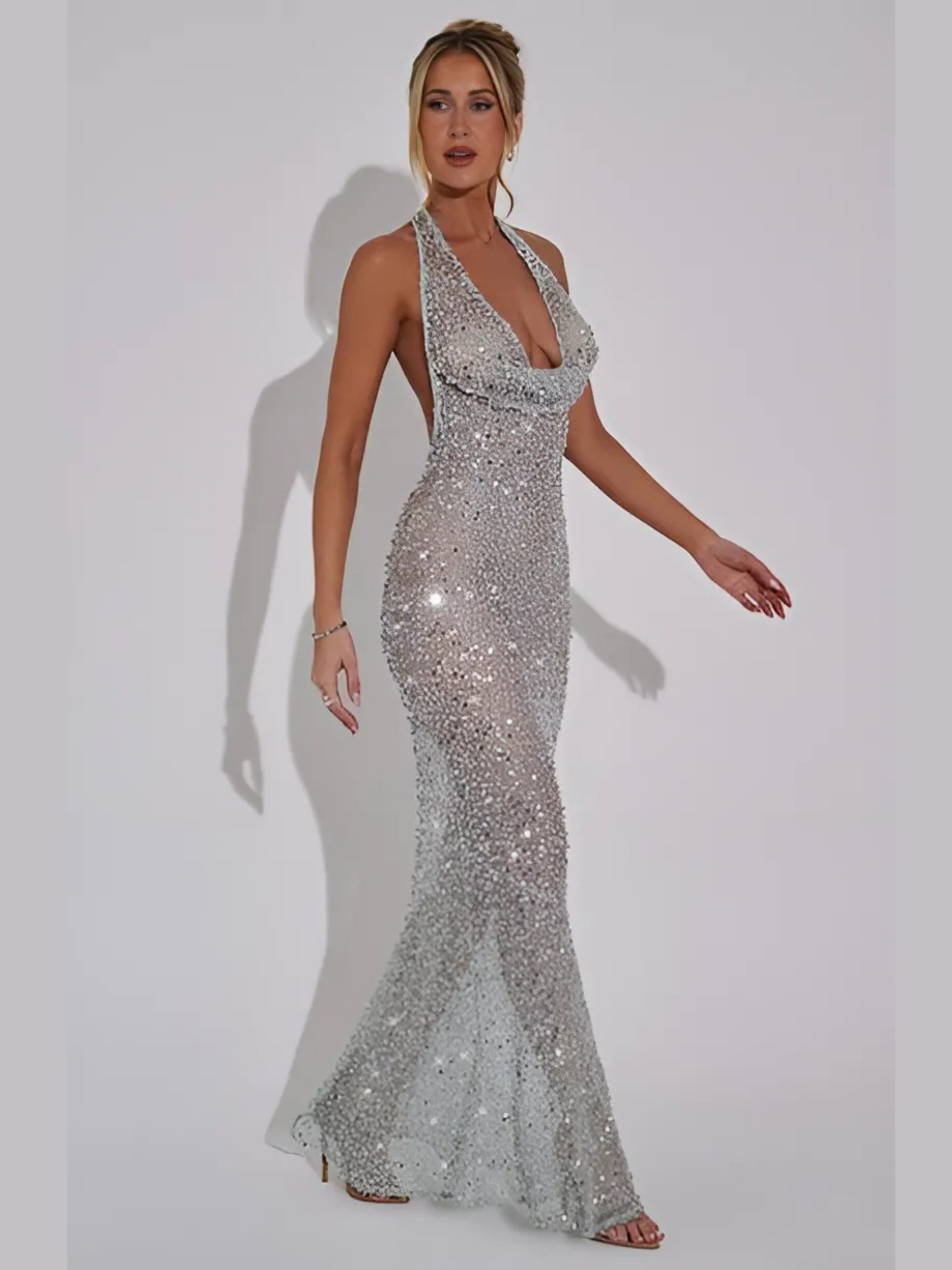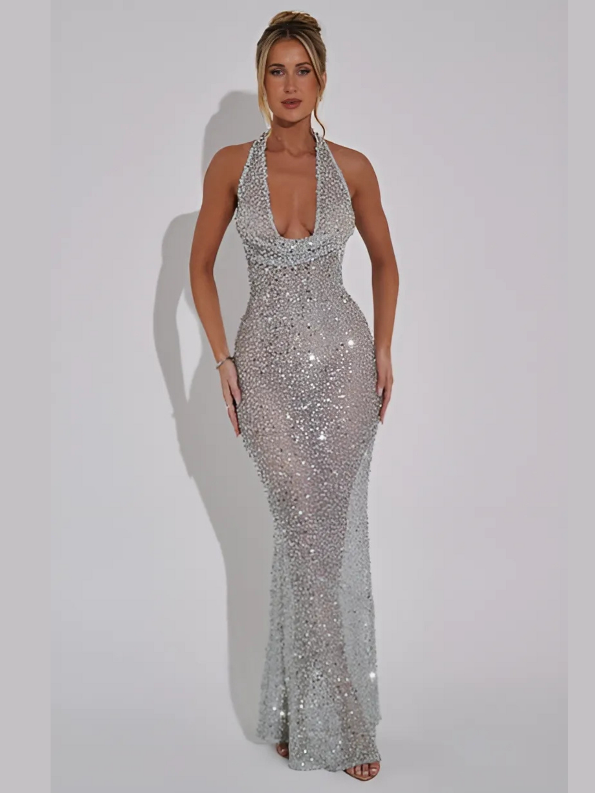 Brilla toda la noche con el vestido Lorena maxi. Confeccionado en un diseño de lujo con malla de lentejuelas y un toque ligeramente translúcido, este vestido destaca por sus tirantes halter, un escote bajo drapeado y una espalda escotada en forma de curva. Su falda cae con elegancia gracias a una costura diagonal. Combínalo con un maquillaje luminoso y un peinado elegante.