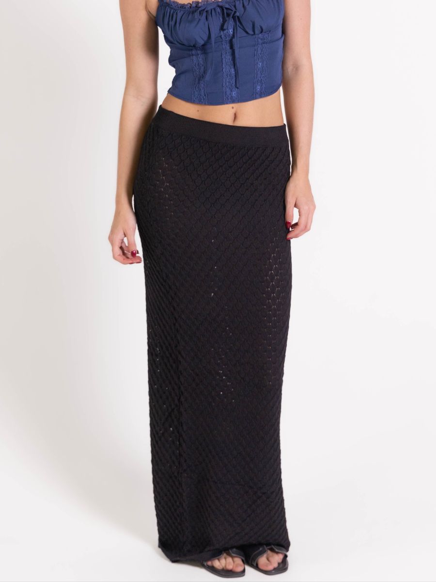 Maddy is a long knit skirt with a beautiful pattern that adds texture and charm. It comes in a soft and elegant black color that suits any look. The skirt can easily be styled on its own or with the matching top if you want a complete set. Perfect for both everyday wear and weekends when you want to be comfortable and cool.
