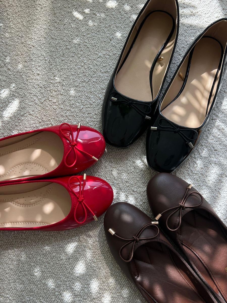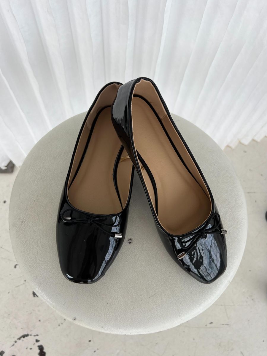 Our lovely Marie ballerina, which has a flatter toe than the classic ballerina style. The shoes come in a shiny PU material and feature a small delicate bow at the front ✨