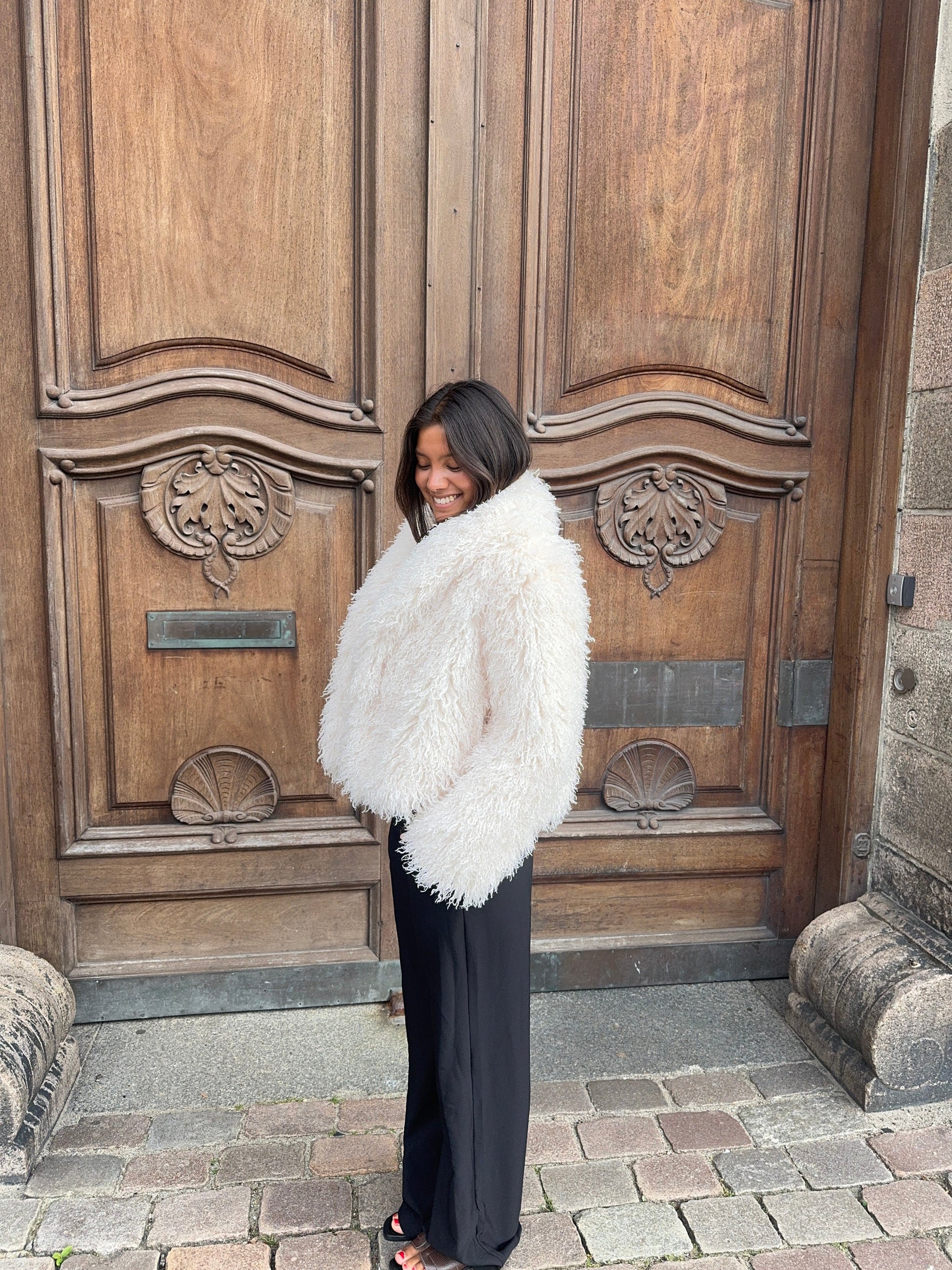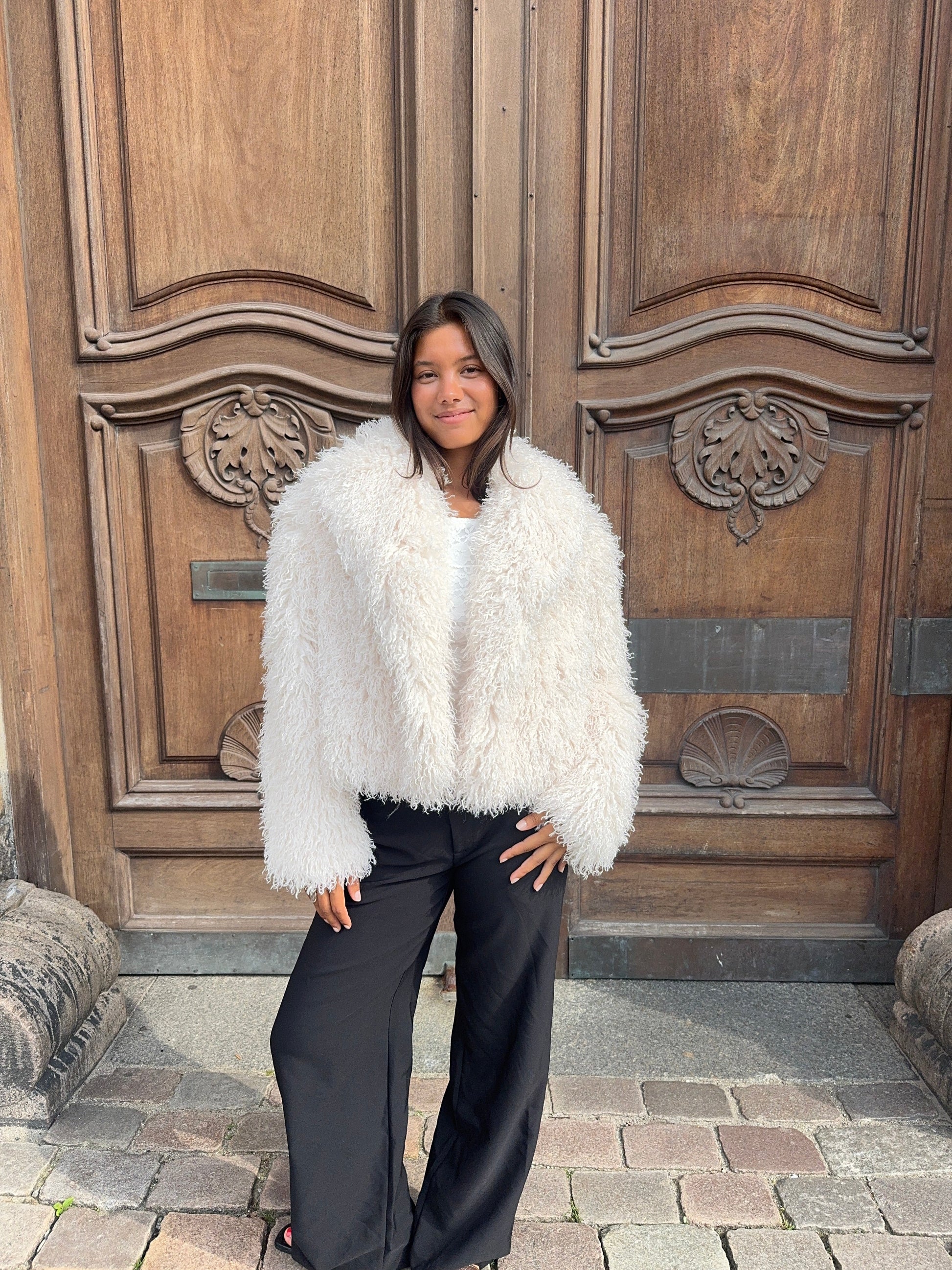 Our Mina fur jacket is a short, soft fur jacket in a beautiful sand color that falls to the waist and gives just the right relaxed yet stylish look. It is made of faux fur, has a button closure, and features an inner waistband for a beautiful finish. Perfect for those who want something stylish and easy to throw on over dresses, jeans, and knitwearβwhether for everyday wear or more formal occasions.