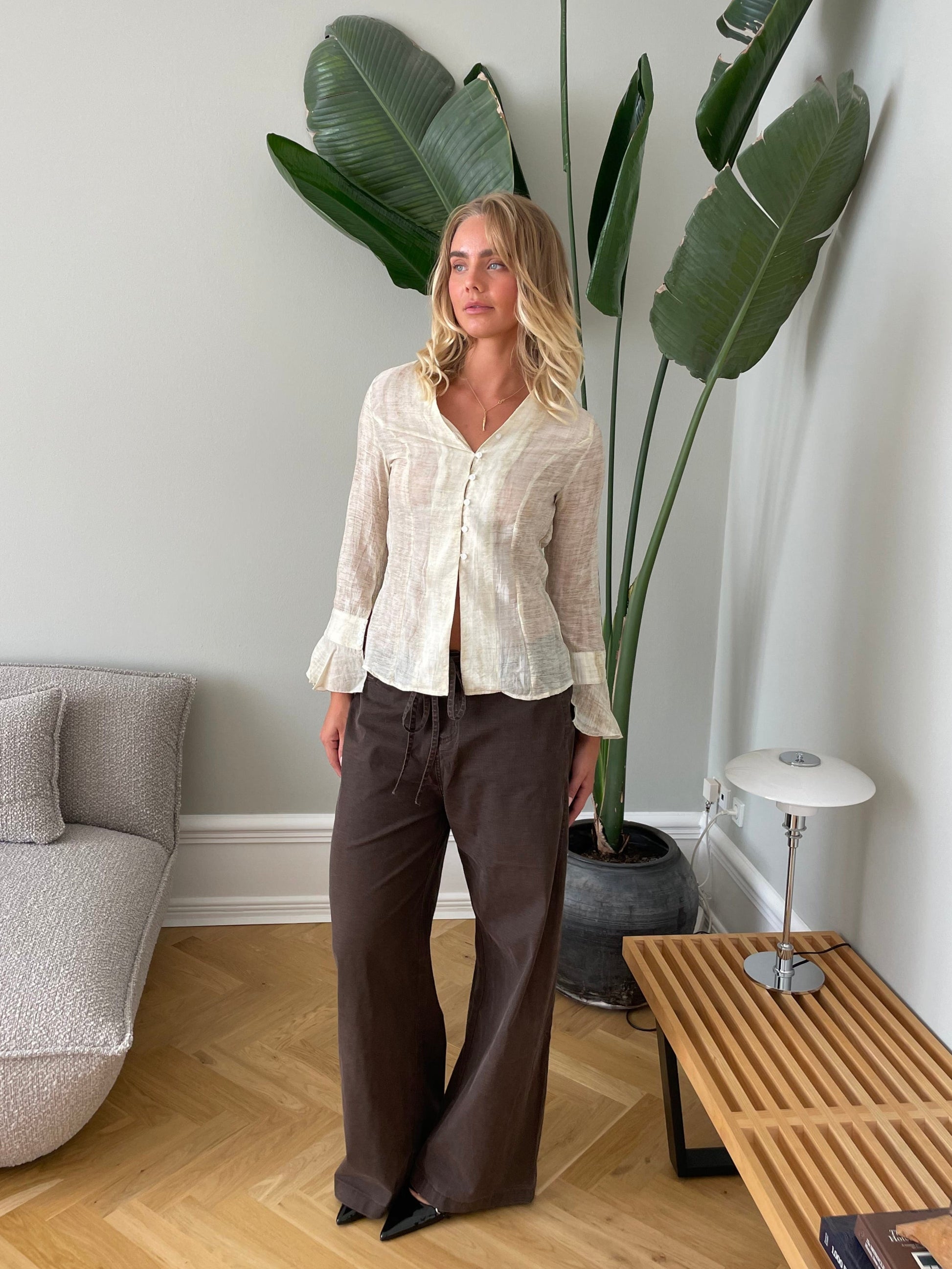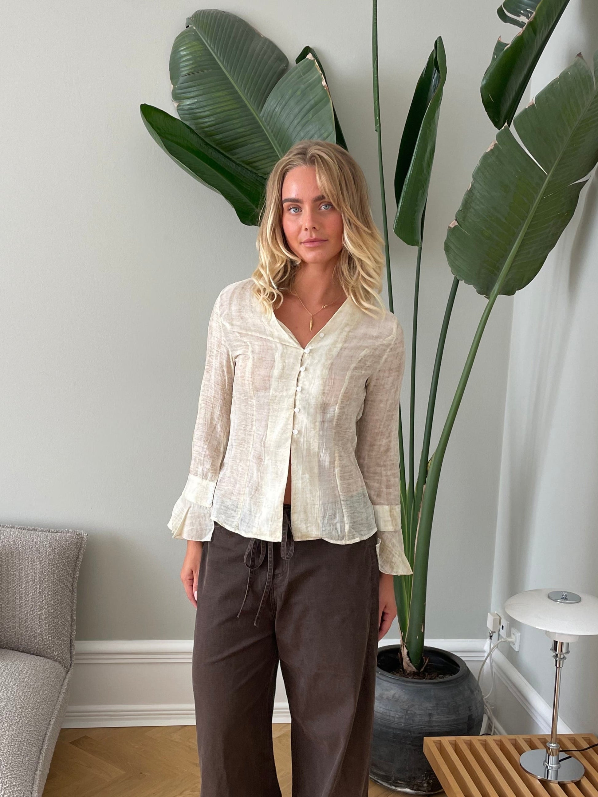 The Mira shirt is an elegant and feminine shirt in beautiful beige. It has a loose fit that drapes nicely while accentuating the waist for a flattering look. With front button closure and a slightly open detail at the bottom, it offers a sleek and modern expression π
