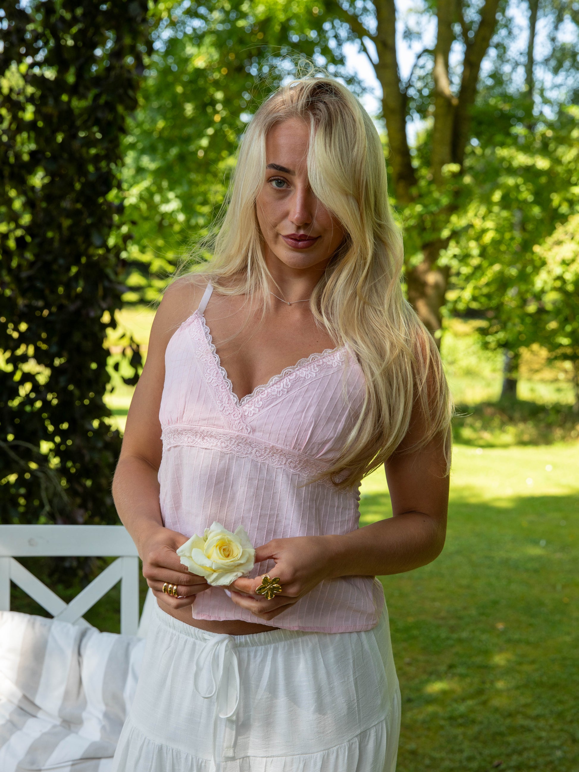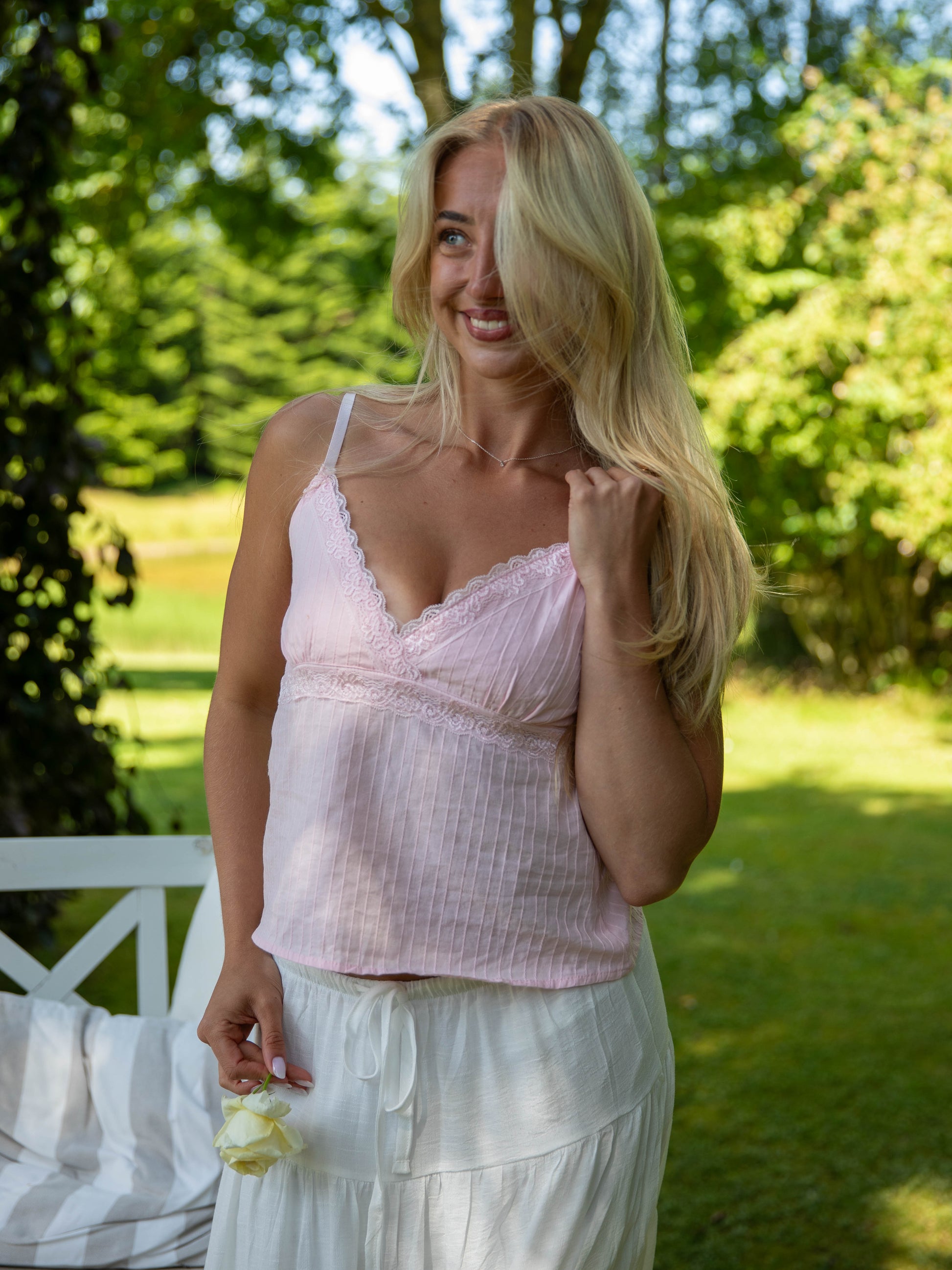 Nia strap top in the finest shade of pink. The top has adjustable straps and a flattering V-neckline with delicate lace details that add a feminine touch. The lightly textured fabric with fine vertical stripes gives an elegant look