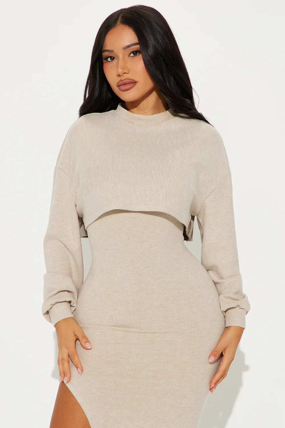 Este elegante Conjunto Nina combina un top de cuello alto y mangas largas con un vestido ajustado debajo para un look moderno y en capas. El dobladillo asimétrico y la abertura alta en el lateral añaden un toque seductor, mientras que la capa superior proporciona dimensión y cobertura. Perfecto para cualquier ocasión, este conjunto combina a la perfección sofisticación con un estilo contemporáneo.