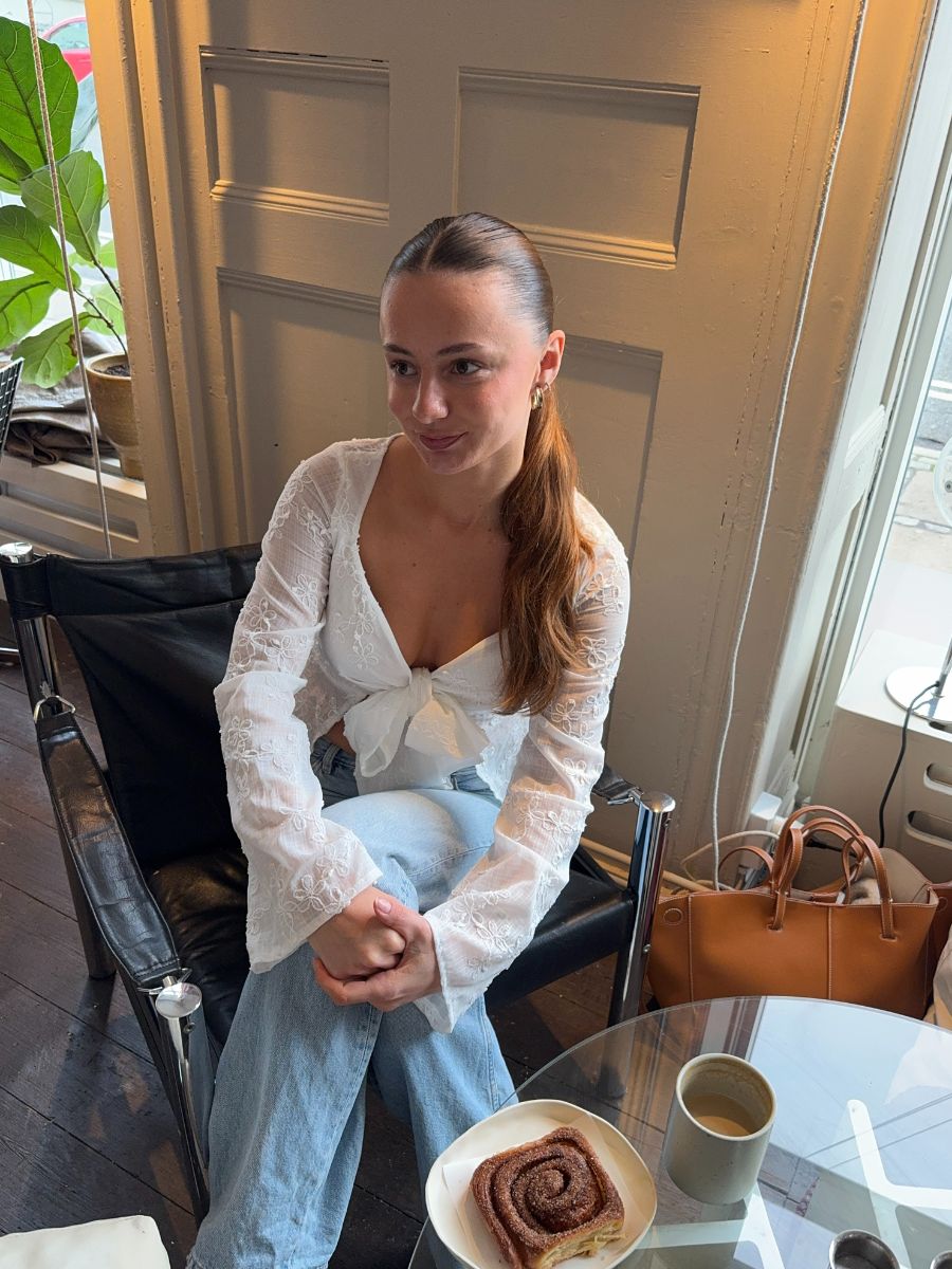 Our beautiful Noelle sweater comes in the finest pattern and has a light texture in the fabric, giving it an exclusive and summery look. The sweater ties at the front of the chest and has loose trumpet sleevesβa real summer top perfect for everyday looks and finer occasions.