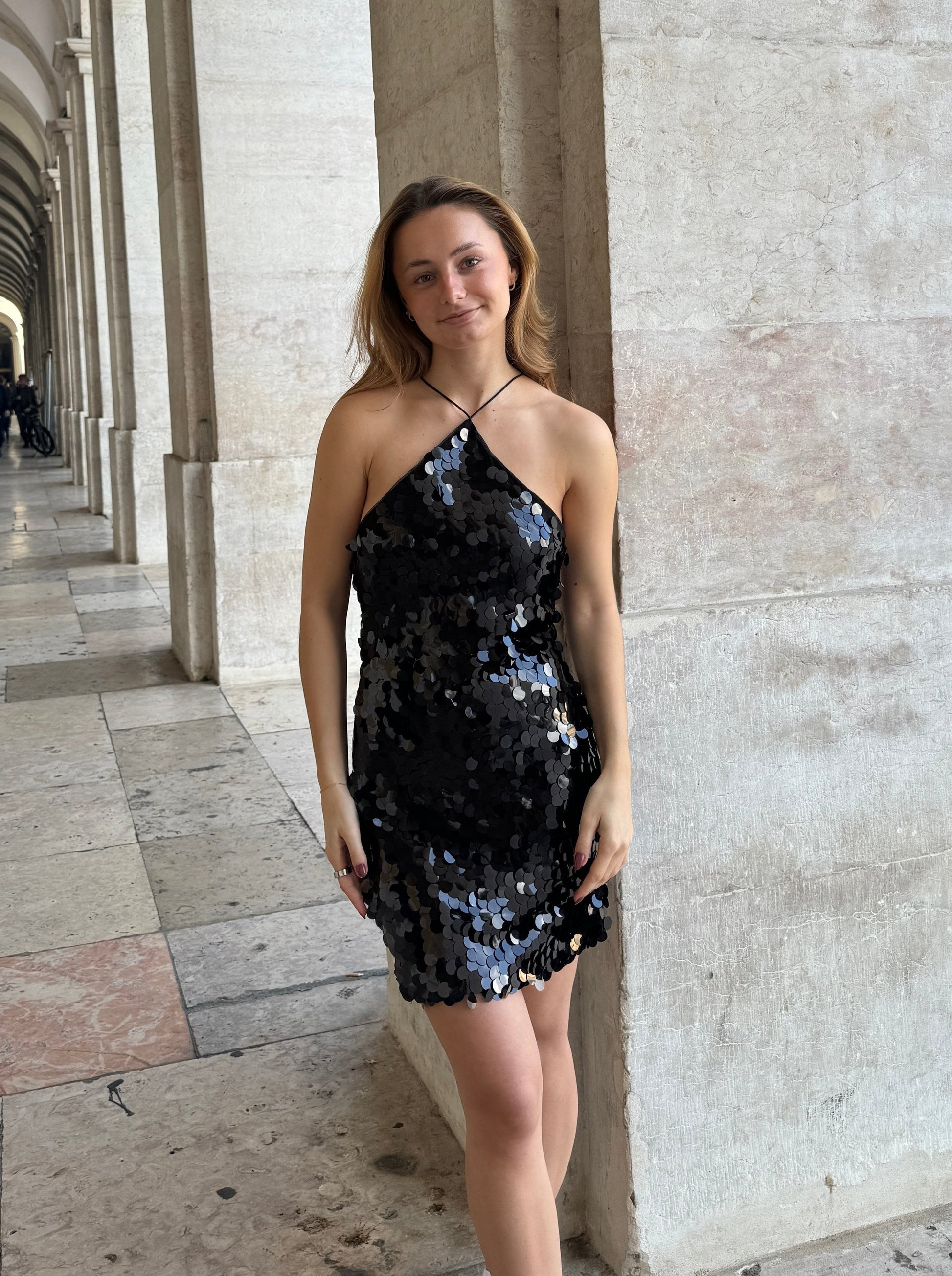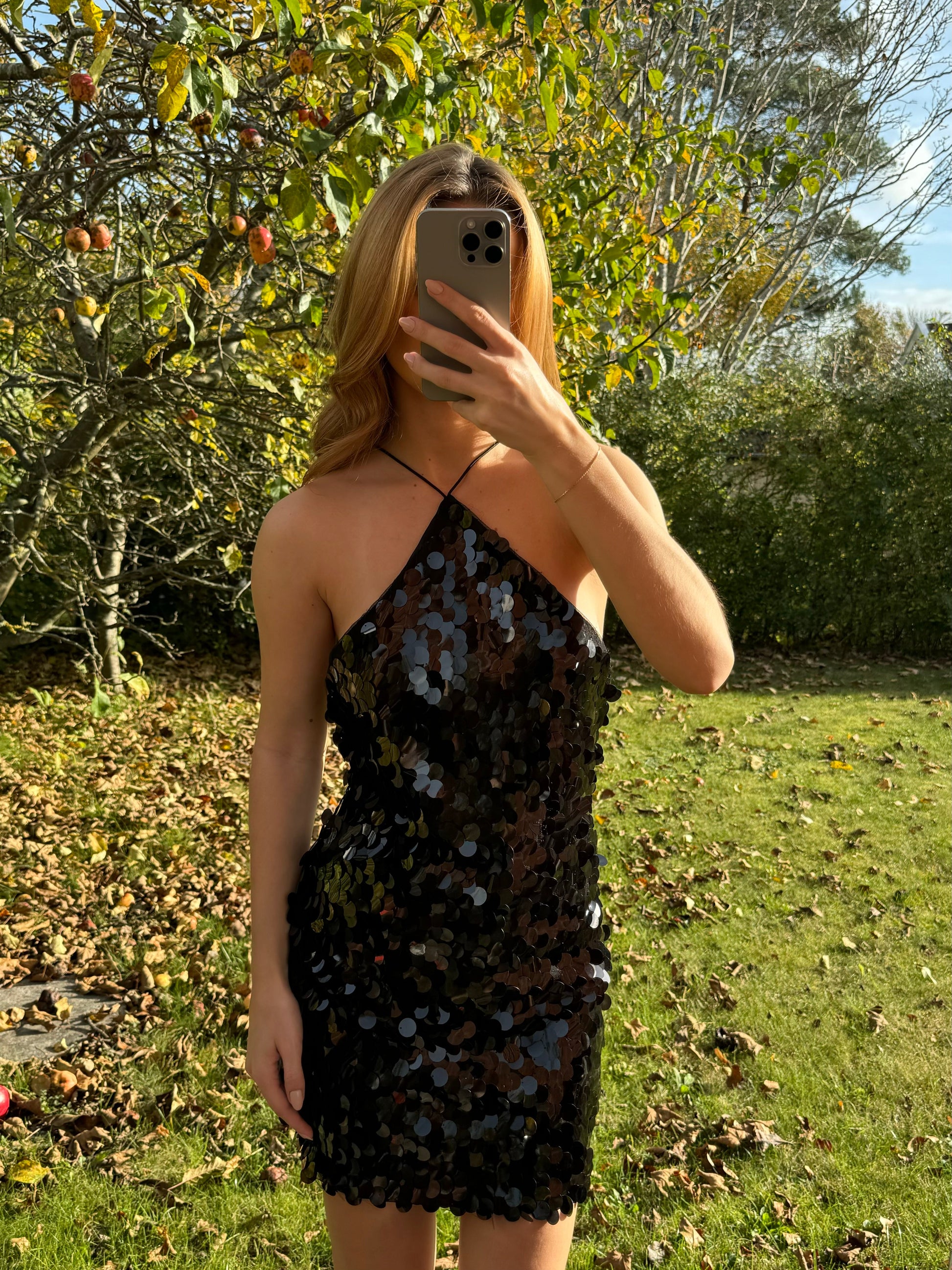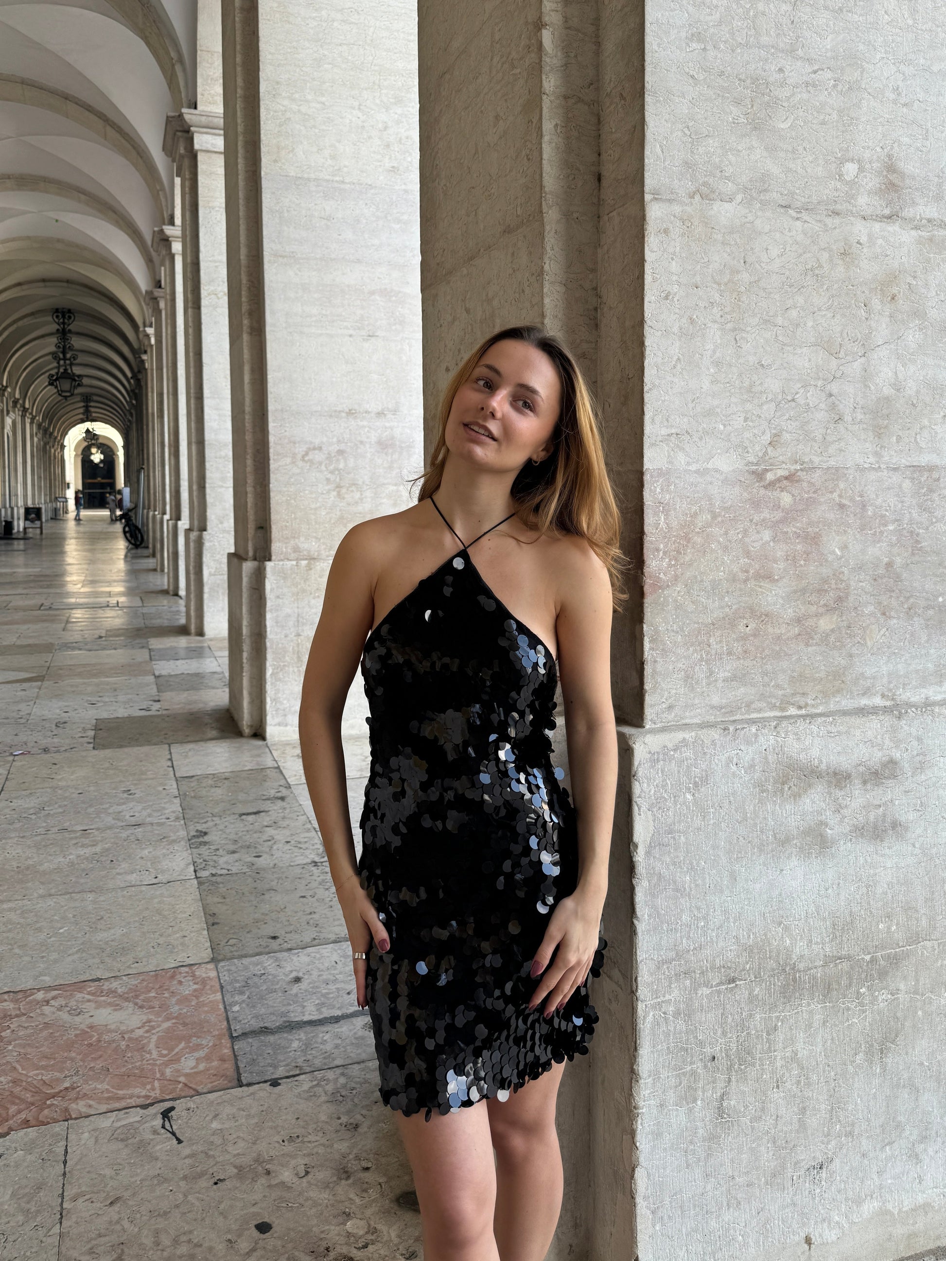 Our Nova sequin dress is the obvious choice for New Year's Eve or other festive occasions. The dress is thigh-length and has a beautiful V-neckline at the front, giving it an elegant look. The low-cut back with two narrow, crisscrossing straps adds a nice and unique detail. A dress that is both stylish and eye-catching — perfect for celebrating special moments in style. 🪩
