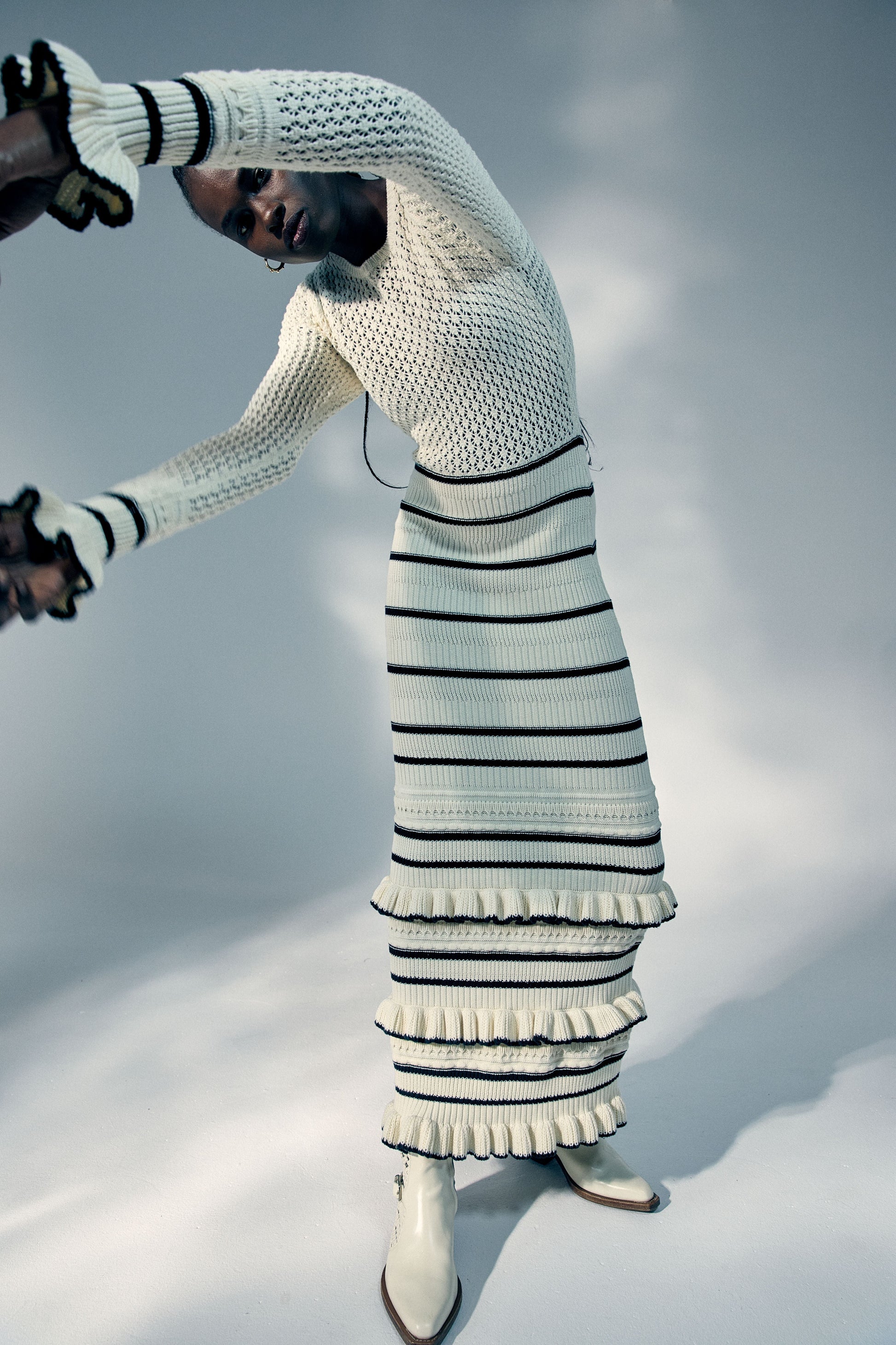 - Detalles: Punto de encaje, cuello redondo, volantes tejidos