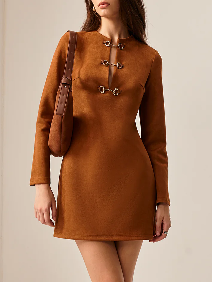 Este vestido corto casual está confeccionado con un 90% de poliéster y un 10% de elastano, e incluye detalles metálicos recortados y un material delgado de gamuza no transparente. Con mangas largas, cuello redondo y un ajuste regular, es ideal tanto para ocasiones de ocio como de trabajo. Su ligero estiramiento garantiza comodidad, mientras que su diseño ofrece un estilo elegante y discreto.
