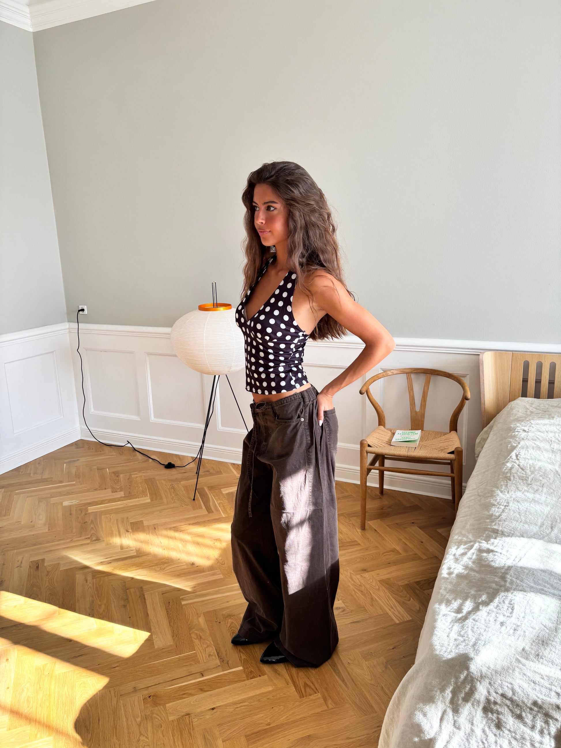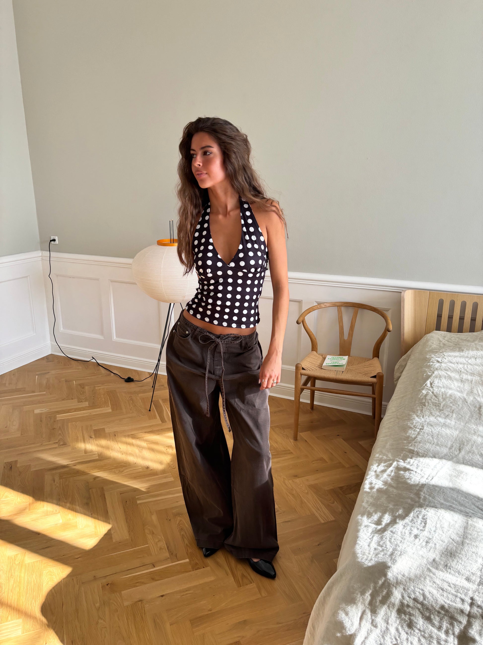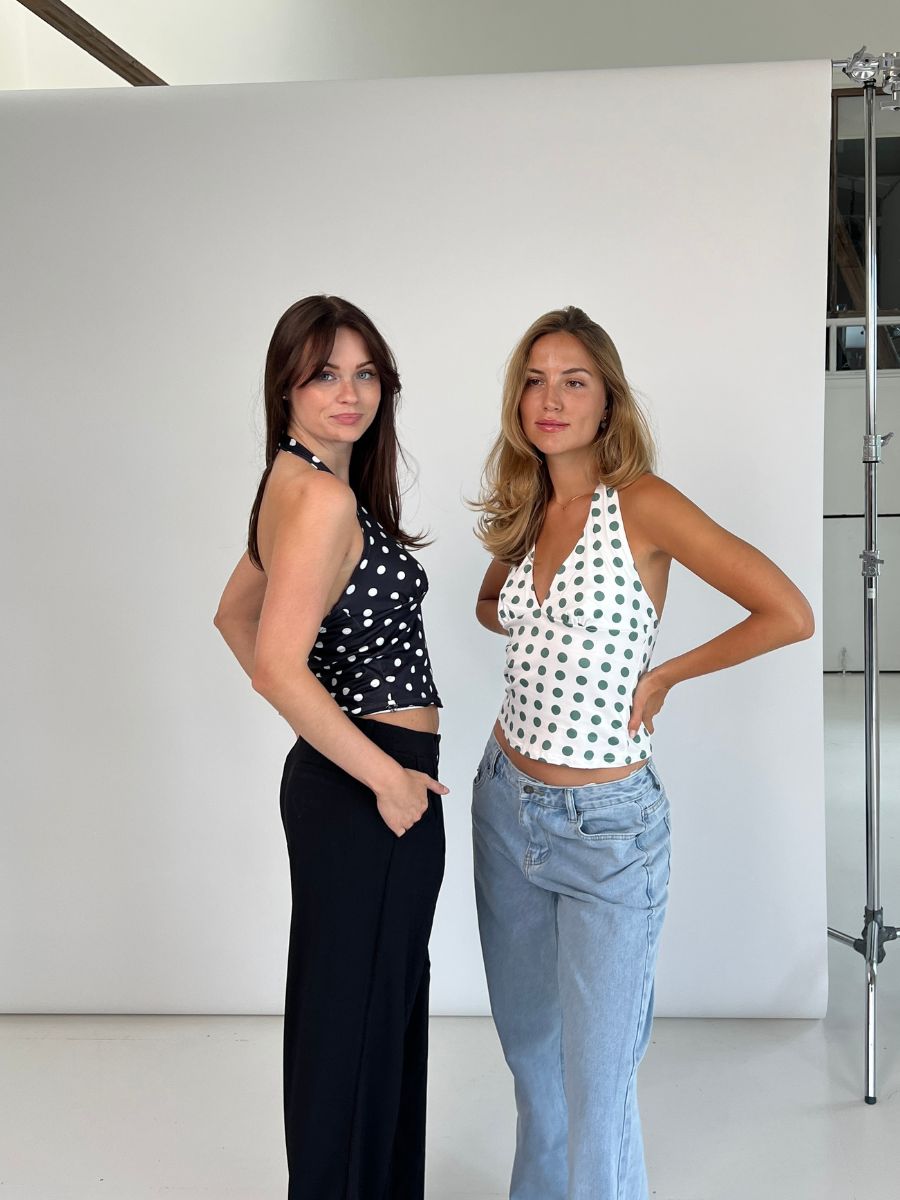 Our Ophelia top in black/white is a close-fitting, stretchy top with the finest white polka dots and a beautiful V-neckline that gives it a feminine look. It has a half-open back and fastens at the neck, adding a nice detail at the back. A versatile top that can easily be styled up or down β whether you're going to a party or just want to spice up your everyday look.