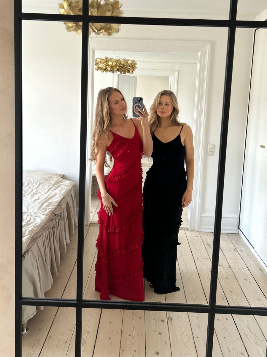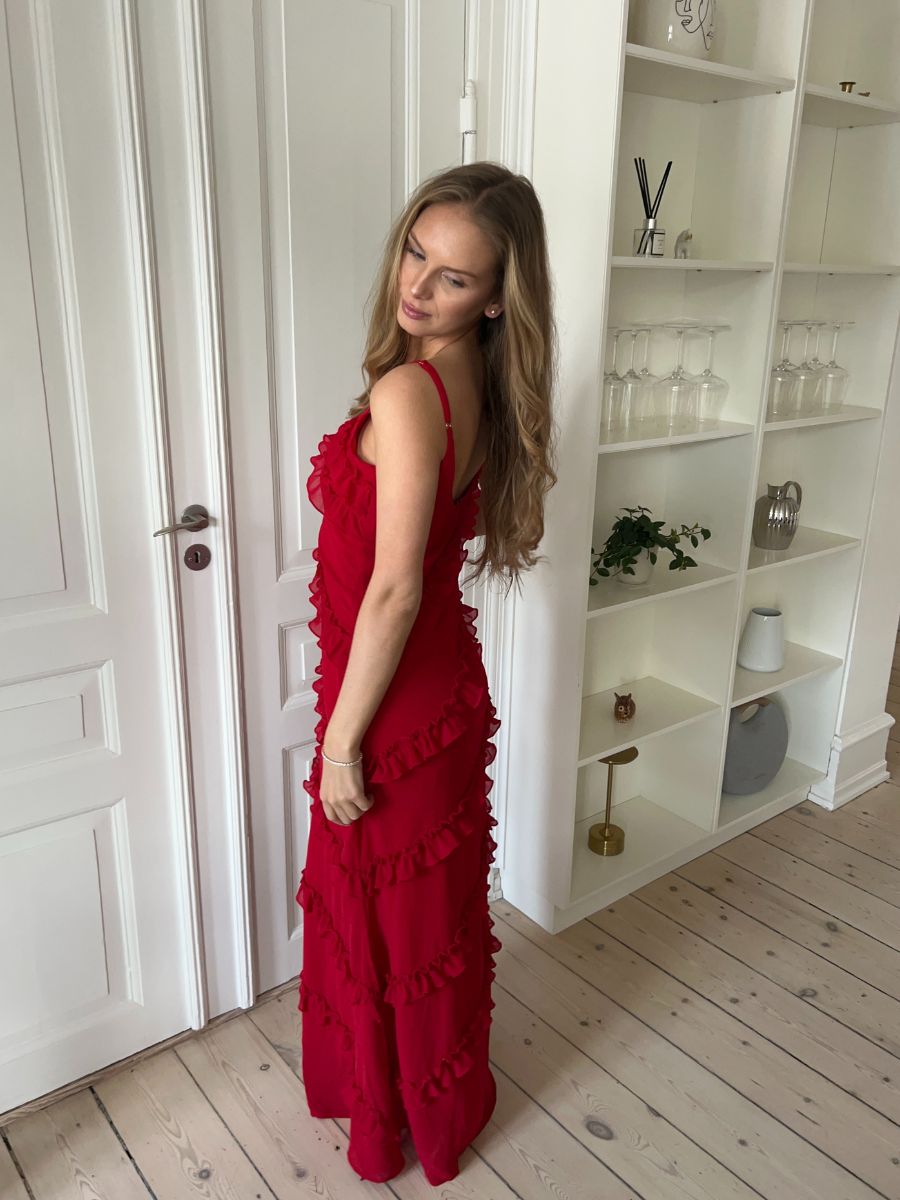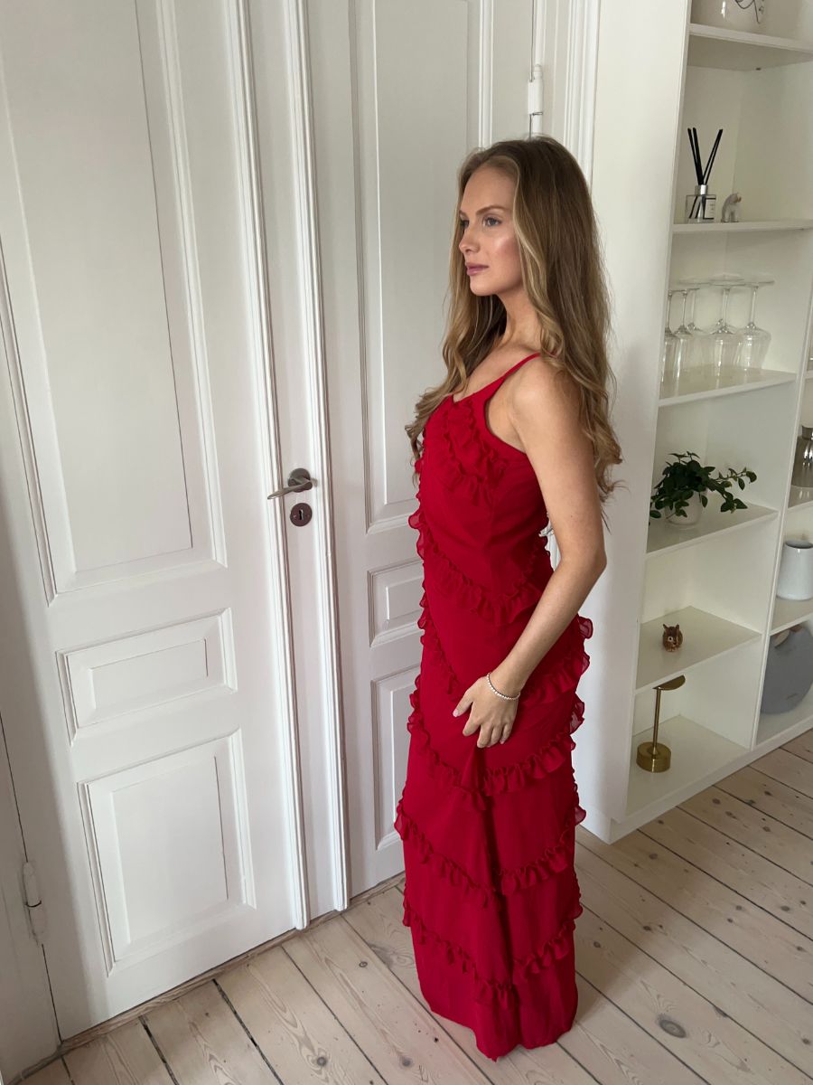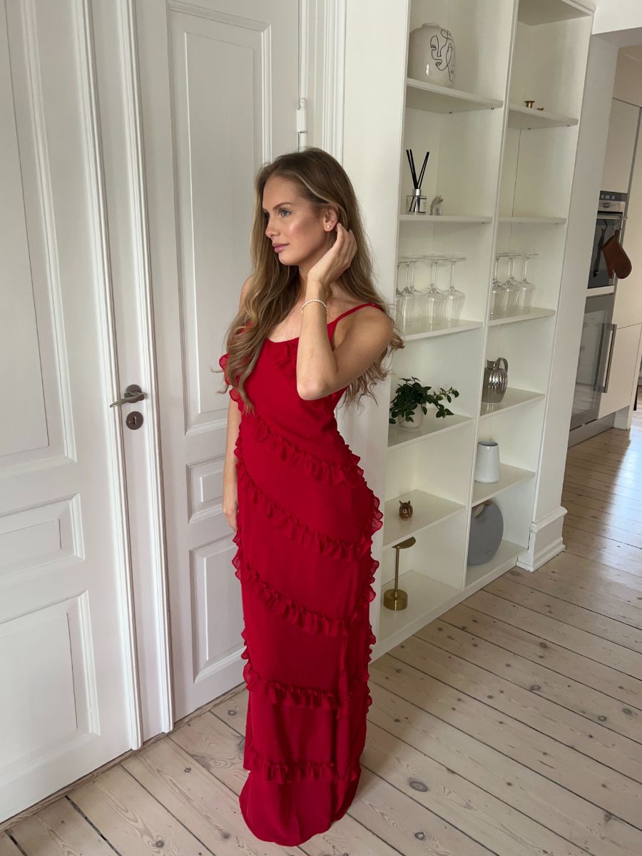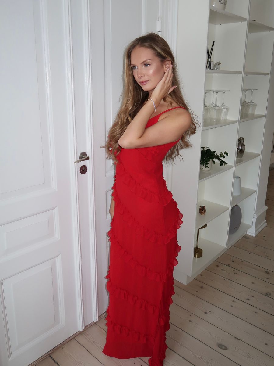 Our elegant Rie maxi ruffle dress is floor-length and has ruffles all the way down, creating a light and airy look. The adjustable straps ensure a perfect fit, while the discreet side zip makes it easy to slip into. The dress is therefore a safe choice whether you're heading to a festive event or simply enjoying a summer evening πΒ The perfect balance between style and comfort.