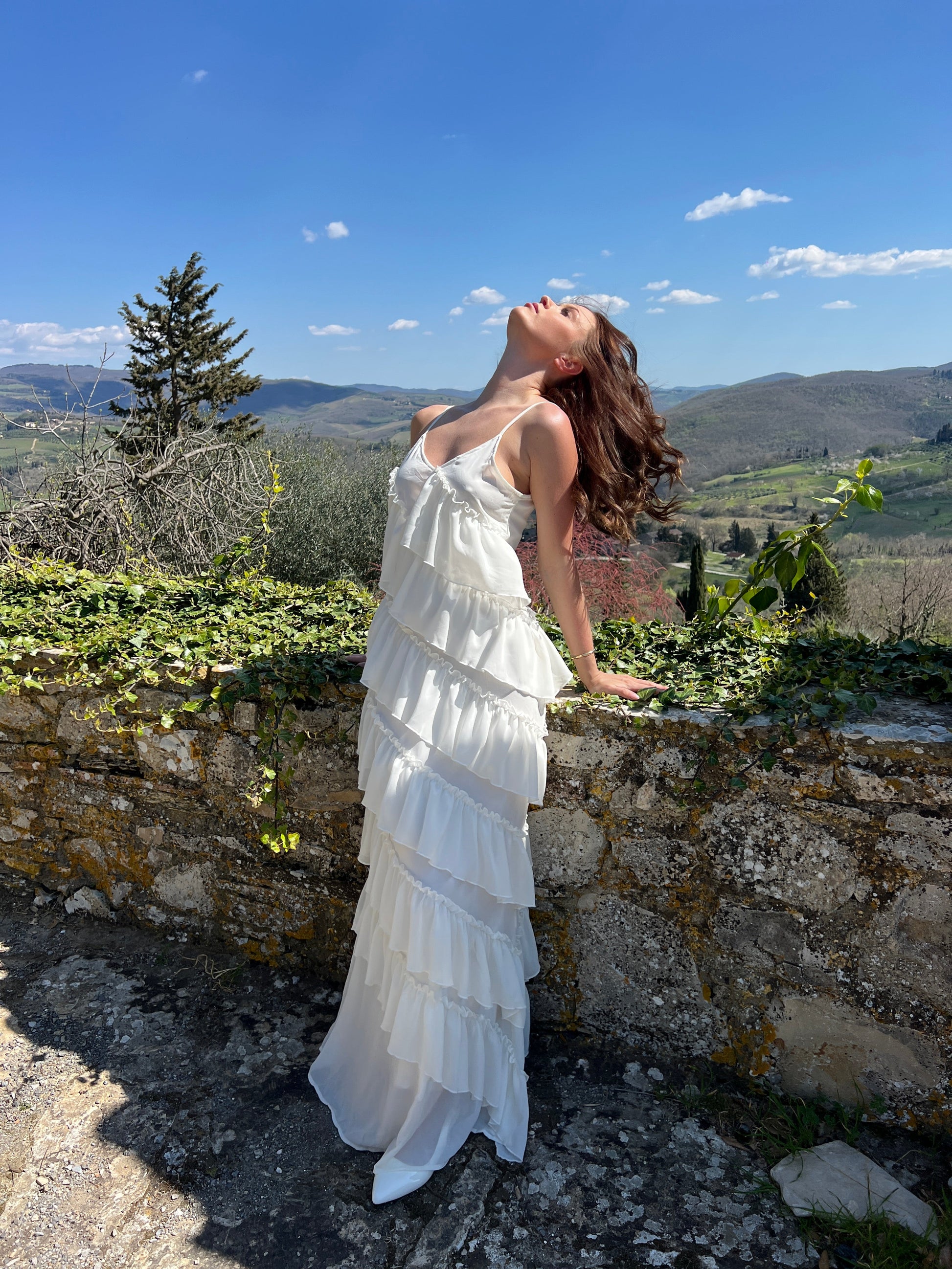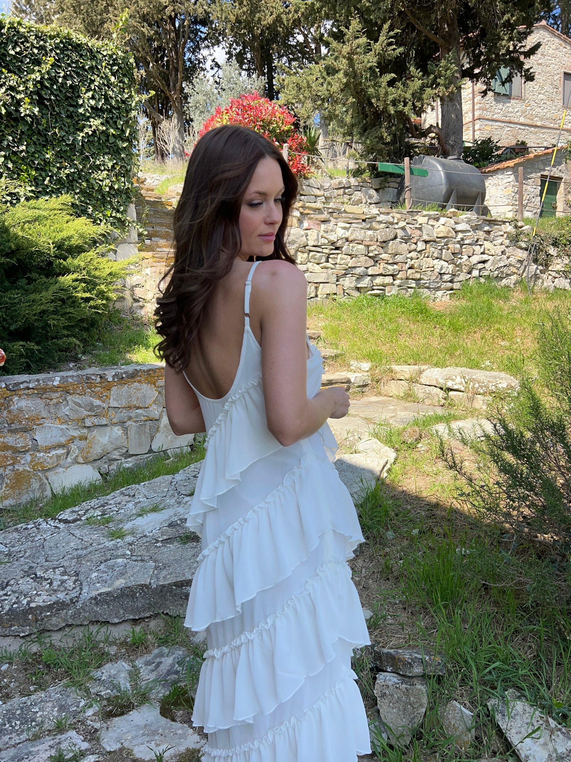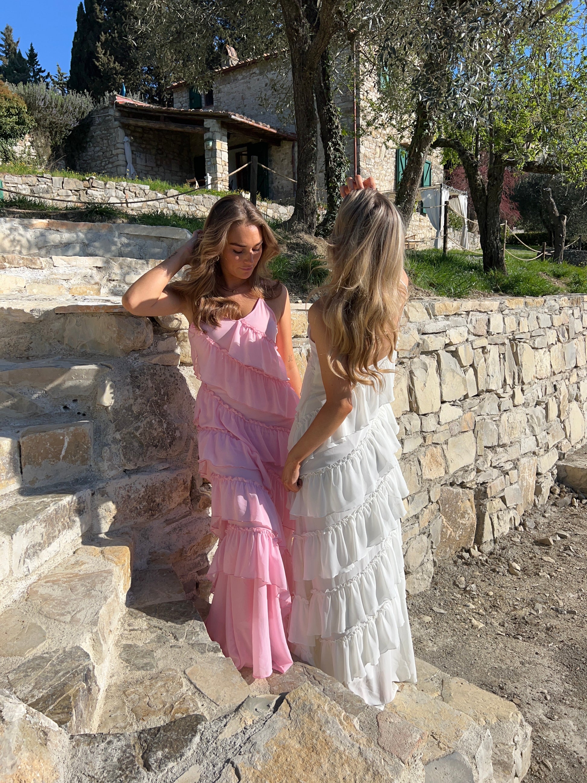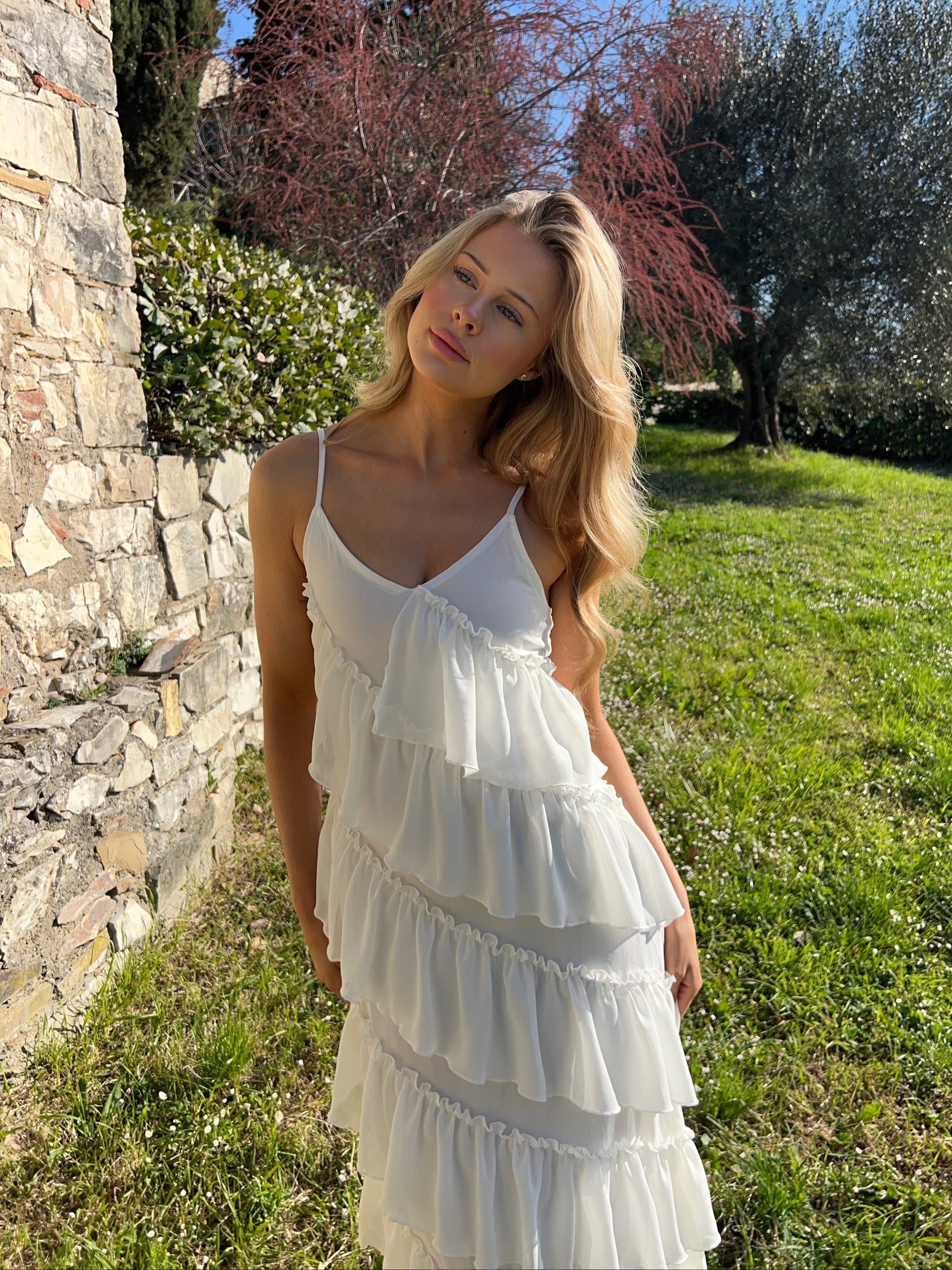 Our elegant Rie maxi ruffle dress is floor-length and has slightly longer ruffles in the white version compared to the other colors. The adjustable straps and side zipper ensure a perfect fit. This dress is a safe choice whether you're heading to a festive event or simply enjoying a summer evening π The perfect balance between style and comfort.