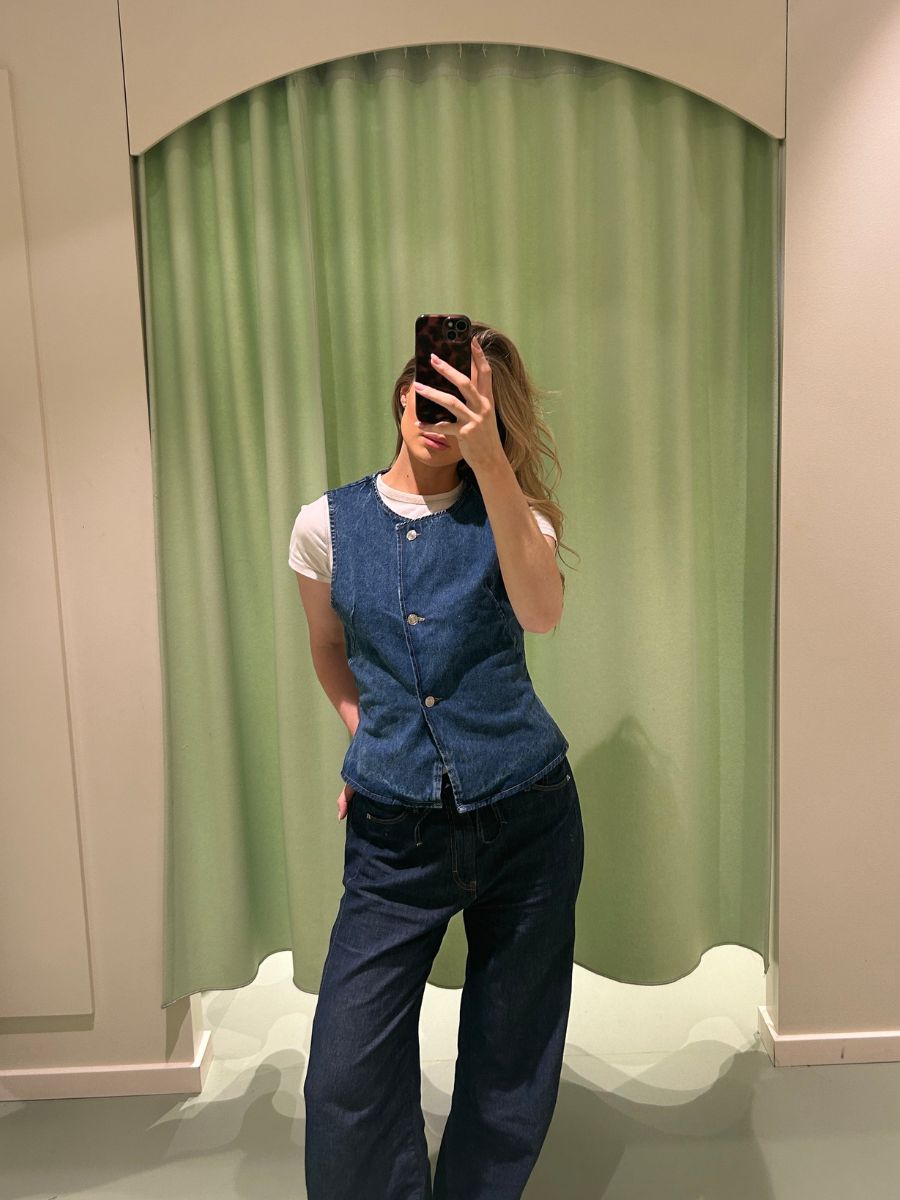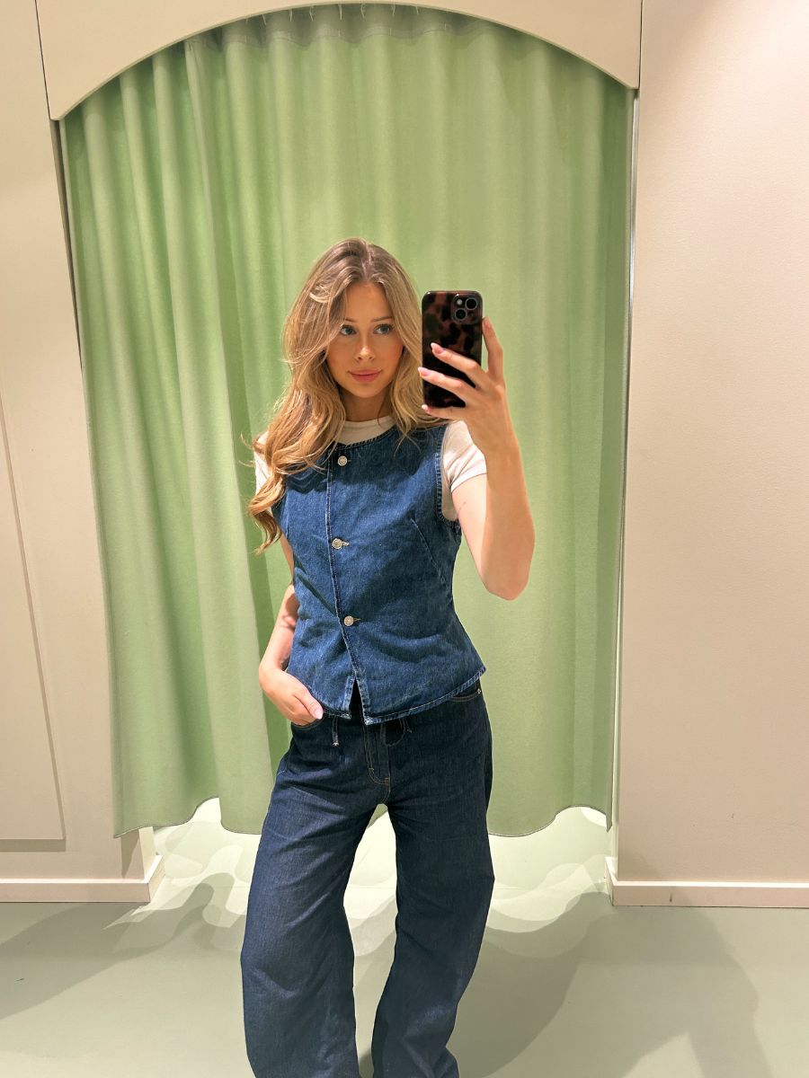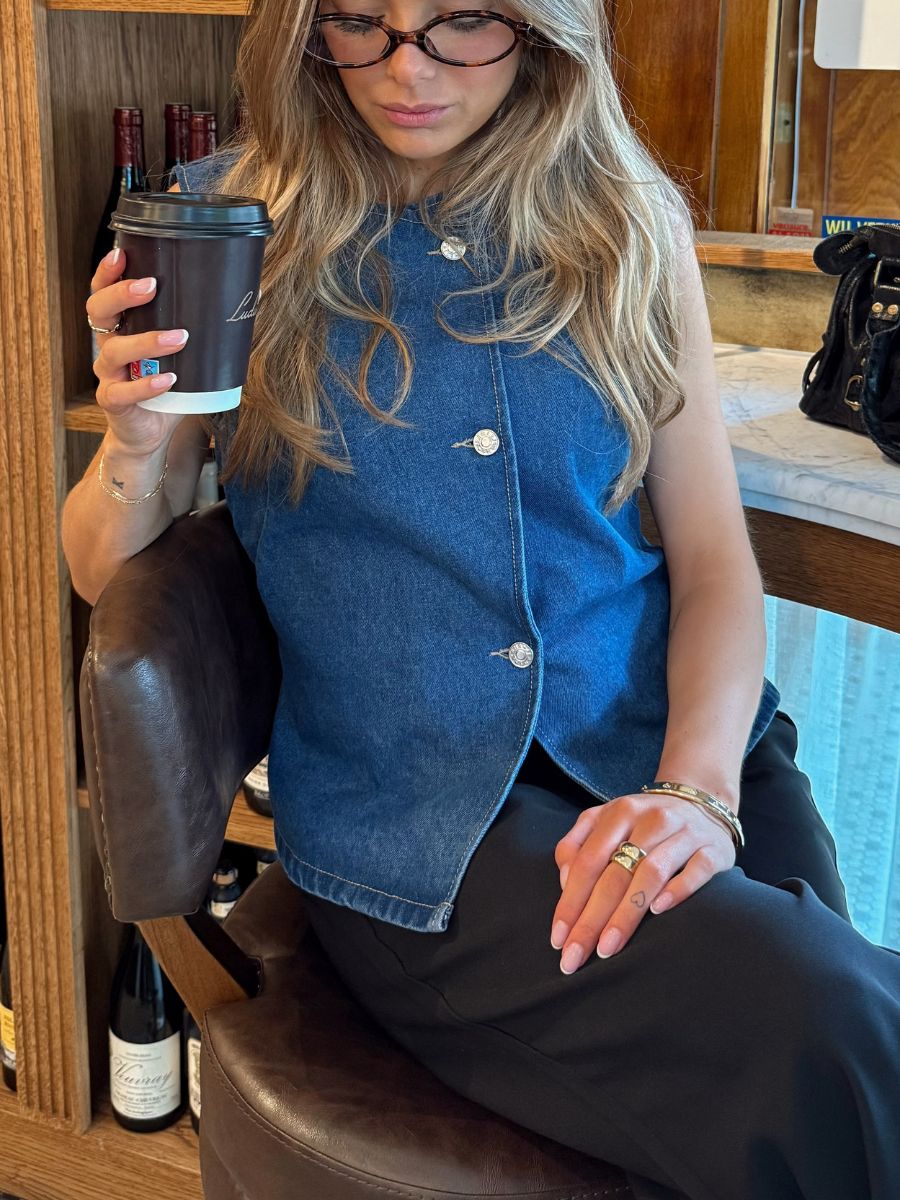 Thea Denim Top is a stylish and feminine top in dark blue denim. It has a form-fitting cut, sleeveless design, and three buttons at the front, giving it a classic and timeless look. Perfect for both everyday use and more elegant styles!